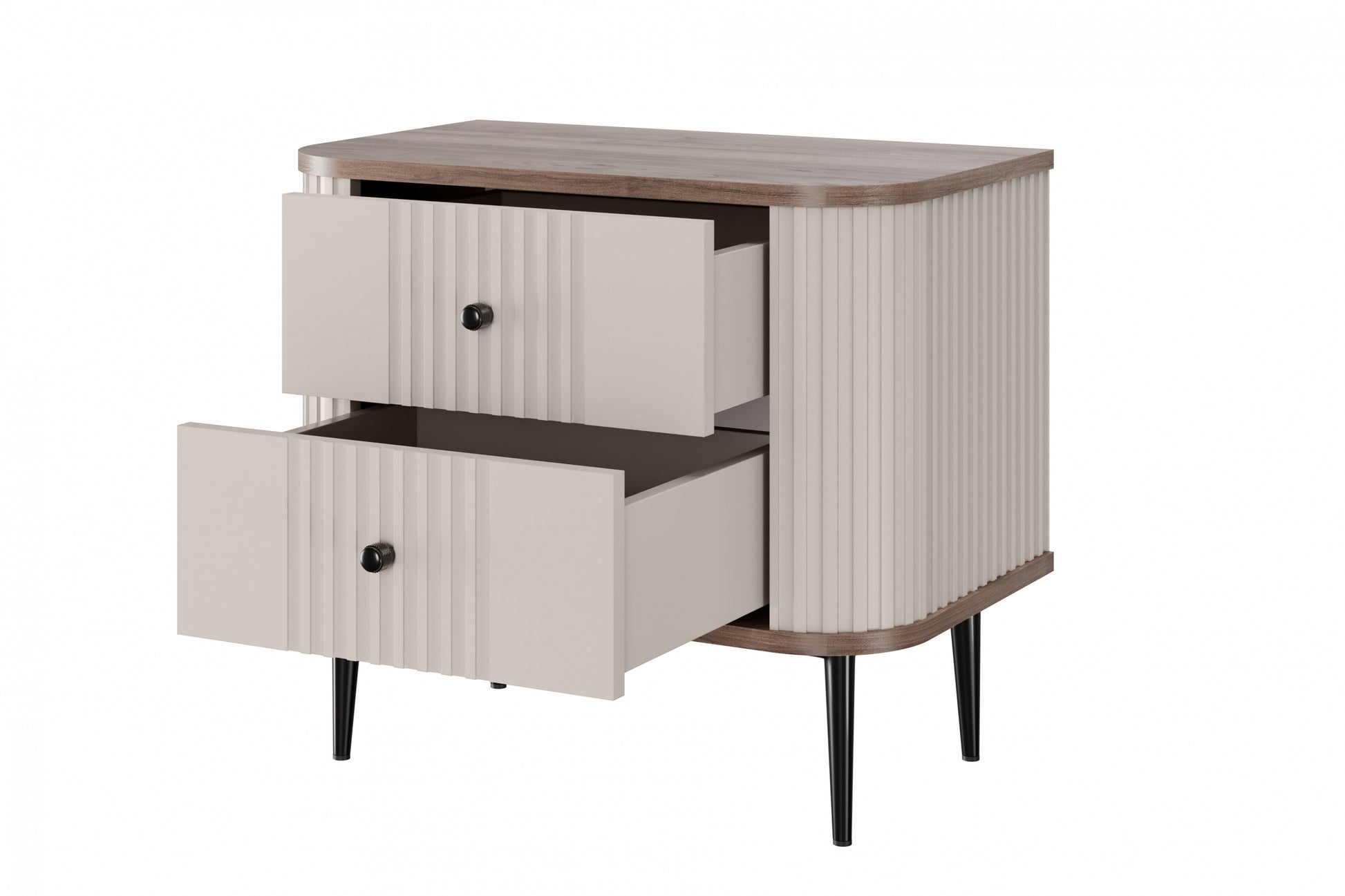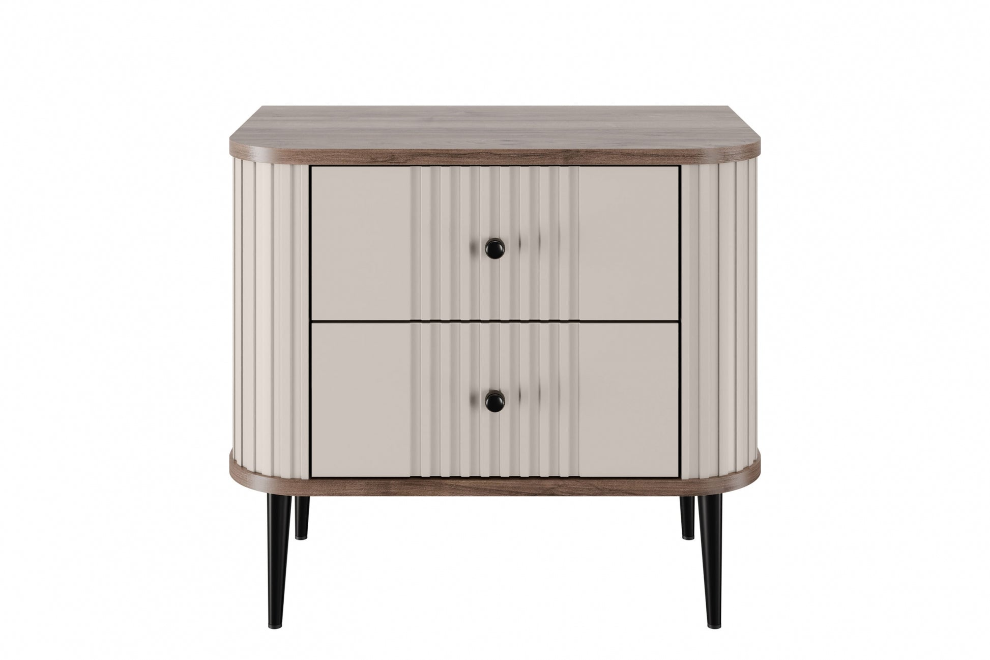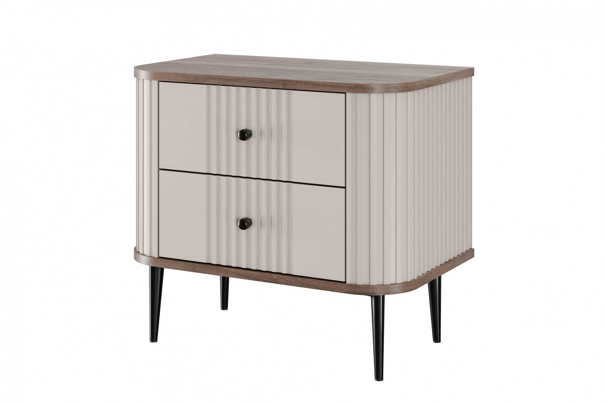 Transformeer uw slaapkamer met de stijlvolle Vesper nachtkastjeset van 56 cm. De combinatie van kasjmier fronten, een walnoot blad en slanke zwarte metalen poten zorgt voor een elegante, eigentijdse uitstraling. Strakke, geribbelde fronten met afgeronde randen geven deze nachtkastjes een modern maar subtiel karakter. Met twee ruime lades en een robuuste MDF-constructie zijn deze kastjes niet alleen mooi, maar ook bijzonder praktisch en duurzaam.