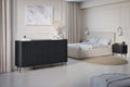 Breng een stijlvolle en functionele touch aan uw slaapkamer met de Vesper nachtkastjeset van 56 cm in diep mat zwart. Deze set is voorzien van opvallende gegroefde MDF-fronten die direct een modern design accent toevoegen. De slanke matzwarte metalen poten van 15 cm zorgen voor een luchtige uitstraling en volgen de laatste interieurtrends. Twee ruime lades met geruisloze sluiting bieden praktische opbergruimte, terwijl afgeronde fronten en ABS-randen veiligheid en duurzaamheid garanderen. Deze nachtkastjes combineren elegantie met hoogwaardige materialen voor dagelijks comfort.