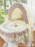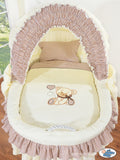 Deze prachtige mand is de grootste op de markt en biedt extra ruimte voor je kleintje. Gemaakt van natuurlijke kleuren van rieten en hout, gecombineerd met volledig beddengoed en een luifelhoes zoals op de foto.