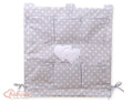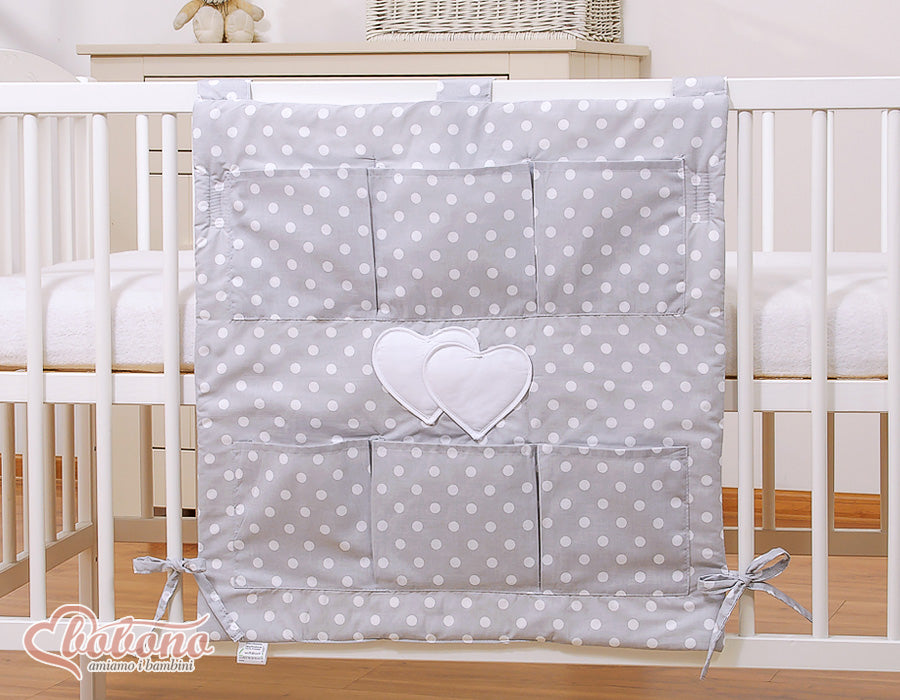 Praktische wieg organizer met wit-gestipte hartjesprint op een grijze achtergrond. Deze organizer heeft 6 ruime vakken, ideaal voor het opbergen van speelgoed, luiers, billendoekjes, fopspenen en andere babybenodigdheden.