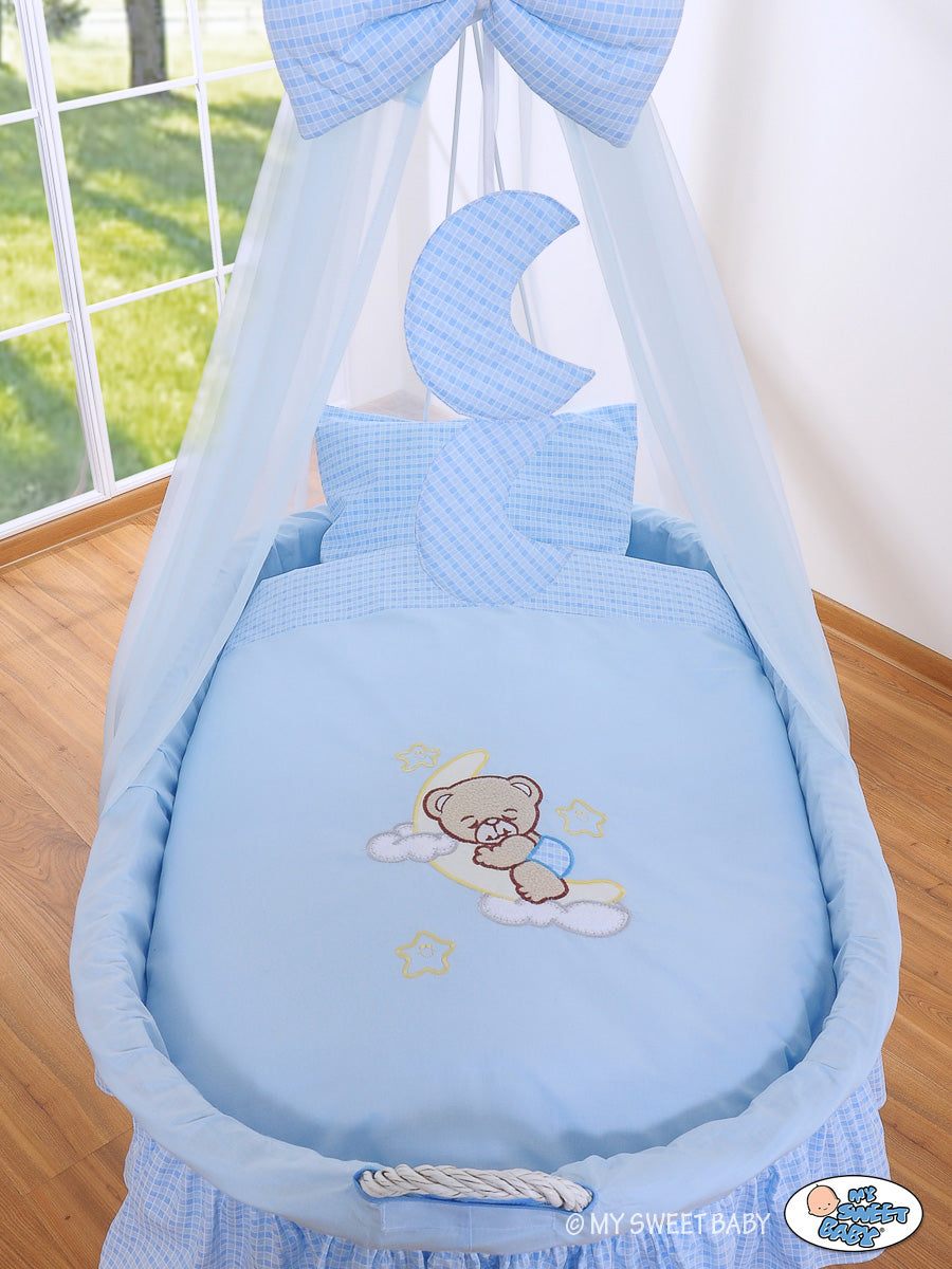 Een prachtige mand die de grootste wieg op de markt is. Gemaakt van wit wicker en hout, en inclusief een compleet beddengoed- en doekenset zoals op de foto.