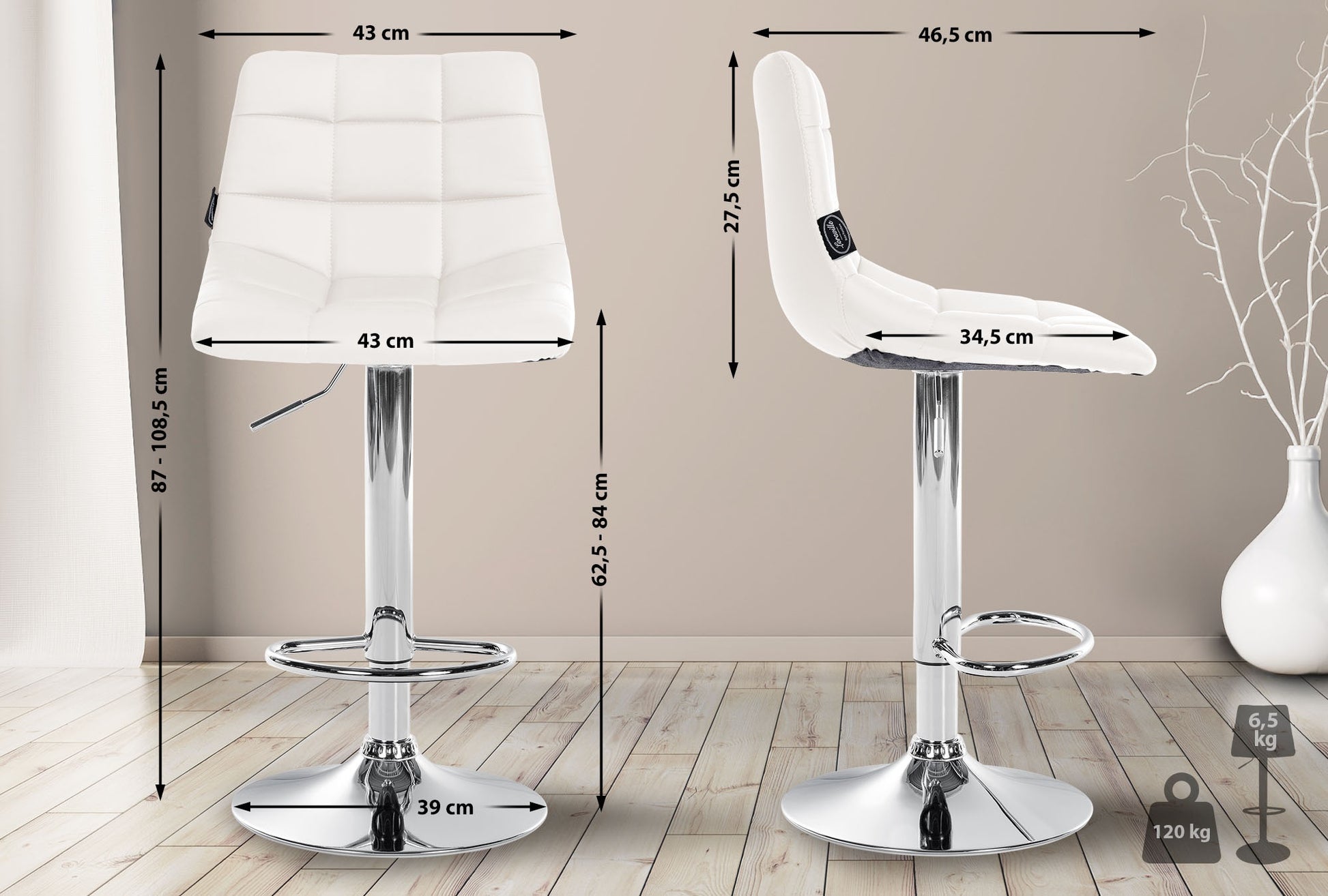 De bekleding is gemaakt van zacht kunstleer met een klassiek gewatteerd patroon. Het stevige metalen frame is beschikbaar in chrome of zwart, wat zorgt voor hoge stabiliteit en duurzaamheid. Het minimalistische en moderne ontwerp past in elk interieur. De krukken zijn eenvoudig te monteren en gemakkelijk schoon te maken met een vochtige doek.