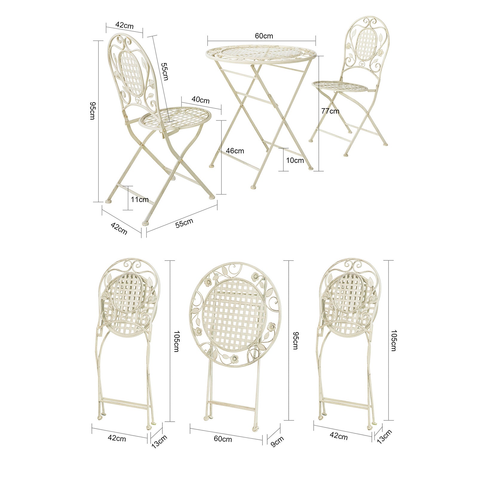 - Afmetingen: Tafel: 60 cm x 77 cm; Stoelen: 42 cm x 95 cm x 55 cm