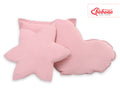 Zachte, pluizige kussens in pastel roze, perfect passend bij de kleur van het tentje. Elk kussen heeft een unieke, decoratieve vorm en is tweekleurig, met beide zijden gemaakt van verschillende materialen. Ideaal als kleurrijke decoratie voor de kinderkamer.