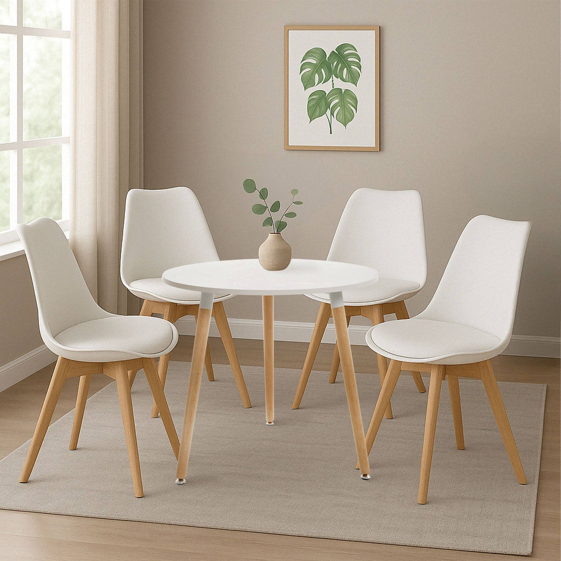 Deze eetkamerset combineert stijlvol een ronde tafel met vier stoelen. Perfect om een comfortabele sfeer te creëren in de eetkamer, keuken of woonkamer.