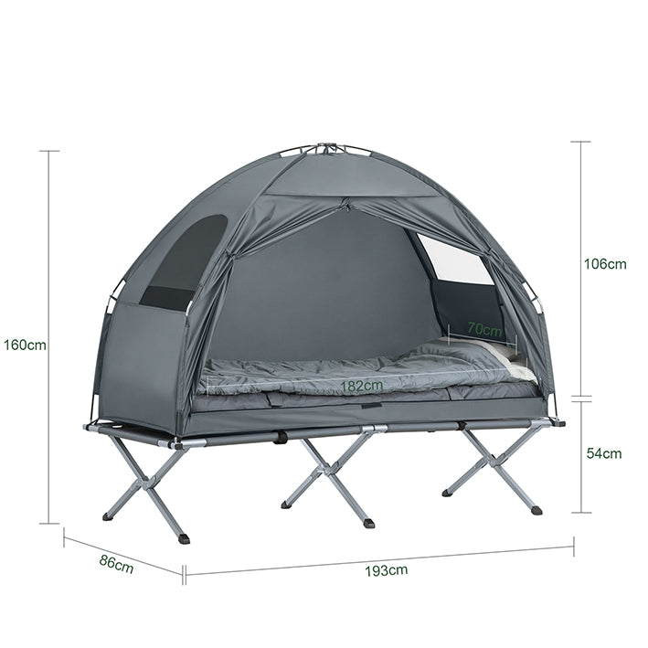 Alles-in-één campingset - Pop-up tent - Draagbaar kampeerbed - Buitenslaapsysteem - Duurzaam Oxford Nylon - Muggenbescherming - Gemakkelijk transport - 193 cm x 160 cm x 86 cm - Lichtgrijs