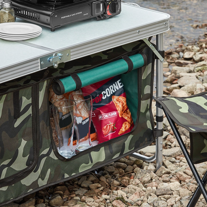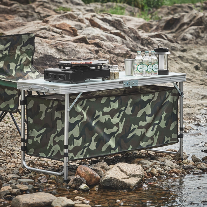 Maak kennis met de veelzijdige kampeertafel met voldoende ruimte voor eten en drinken, in hoogte verstelbare aluminium poten en windbestendige opbergzakken. Perfect voor kamperen, picknicken en buitenbijeenkomsten.