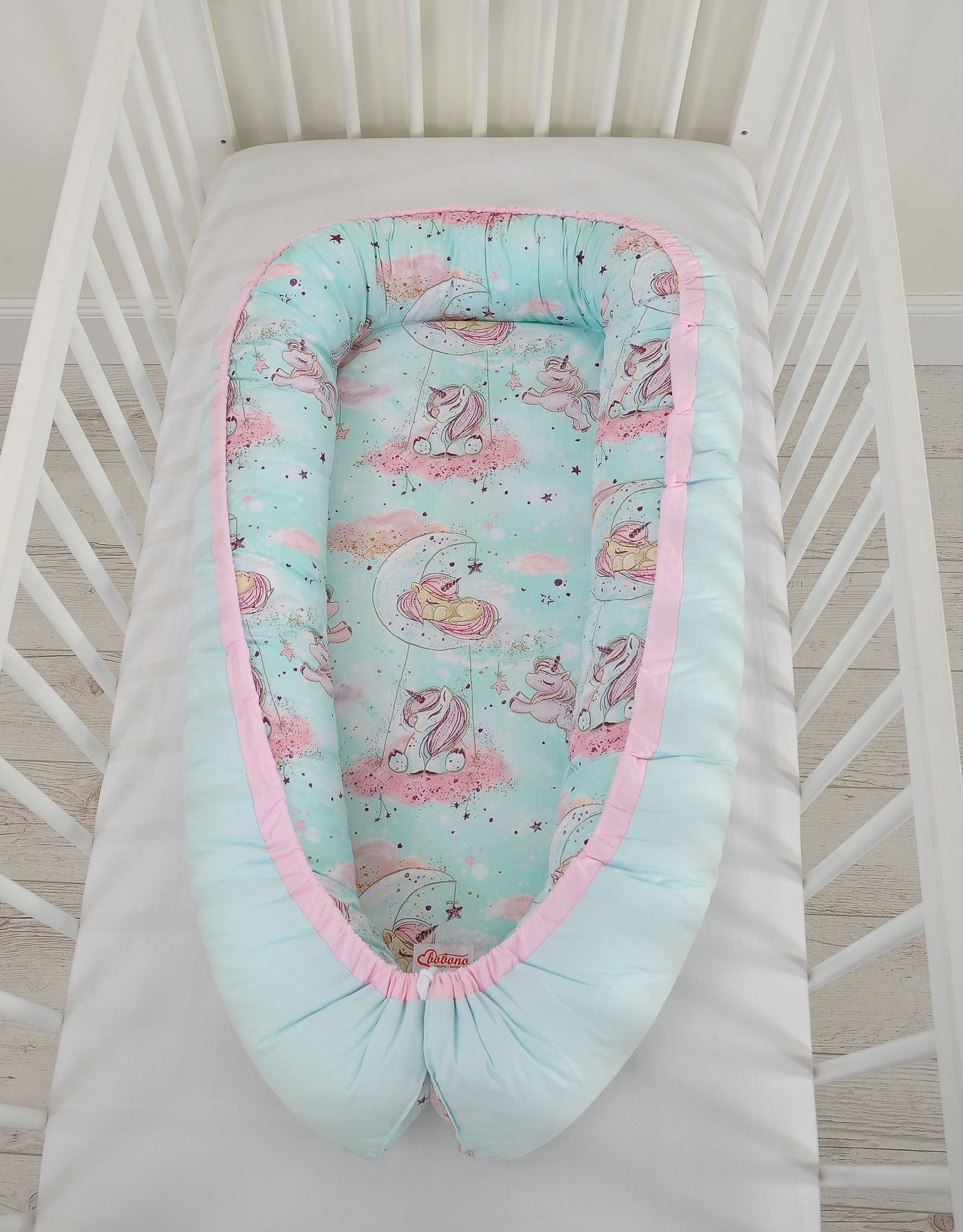 Baby nest, cocoon, optimale veiligheid en comfort voor baby's – Dubbelzijdig – Unicorn Mint/Mint