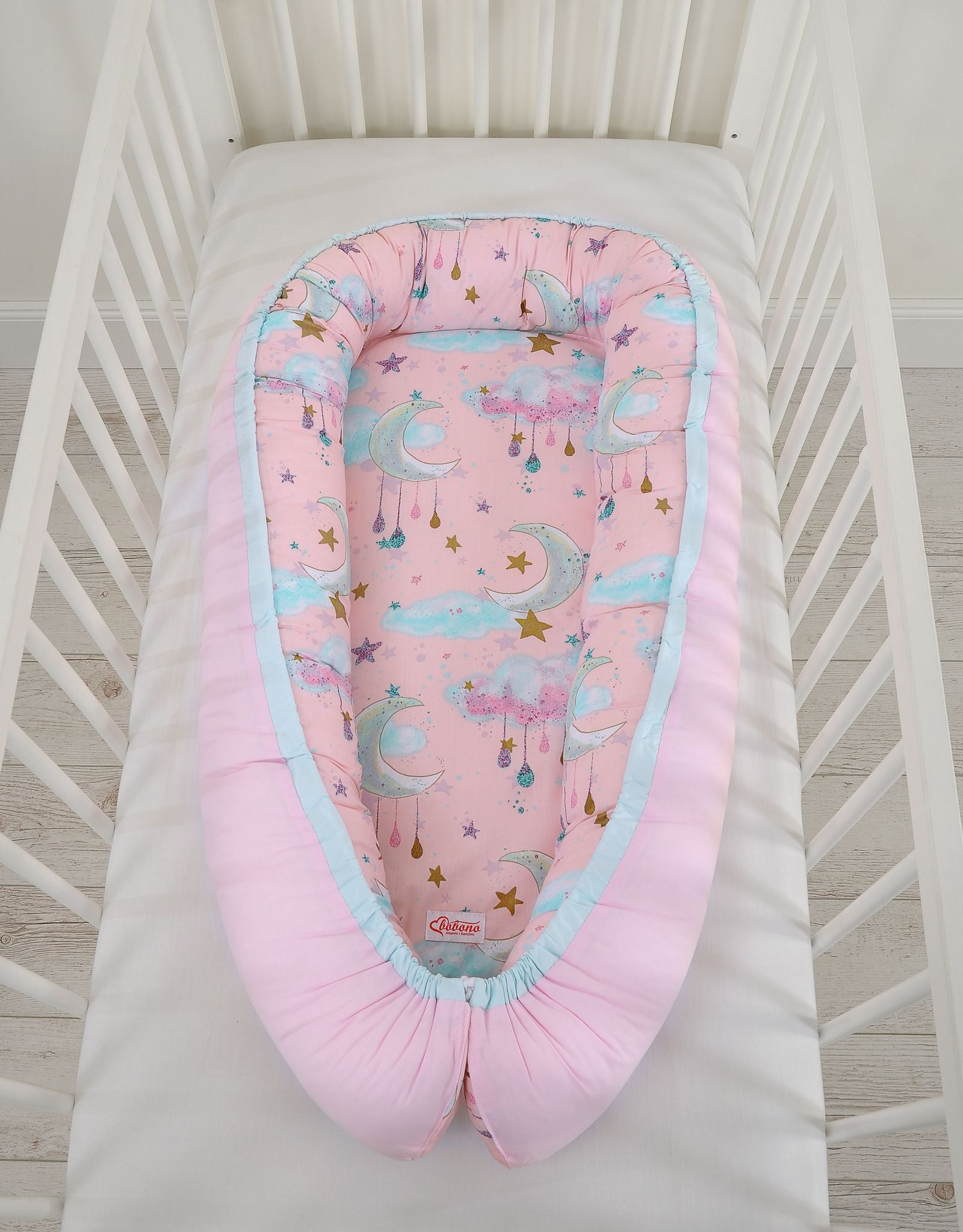 Baby nest, cocoon, tweezijdig en ademend – Oeko-Tex katoen – BOBONO Moons Pink