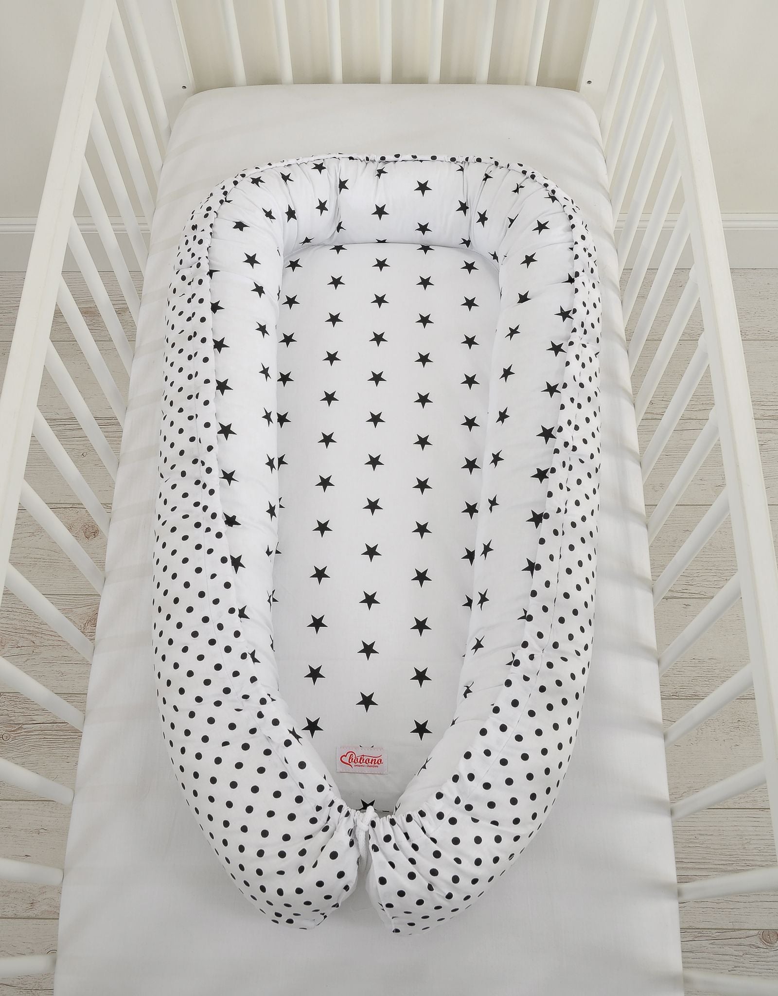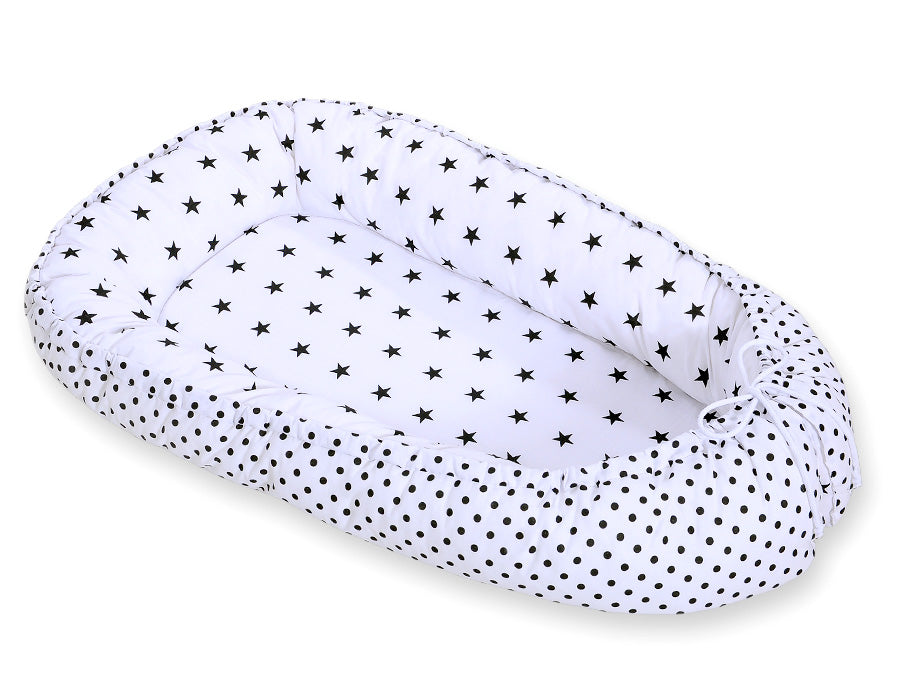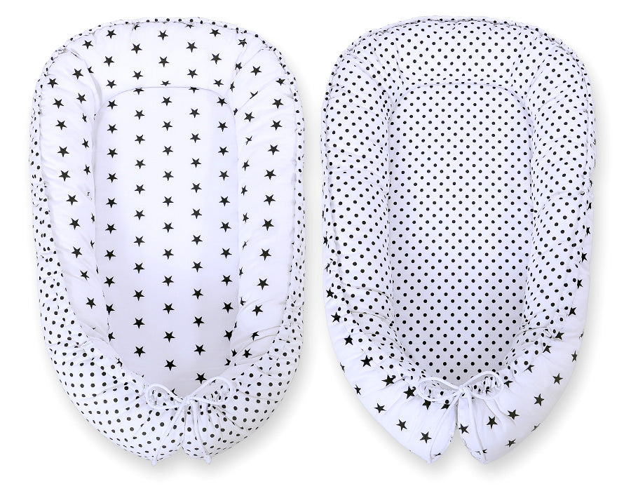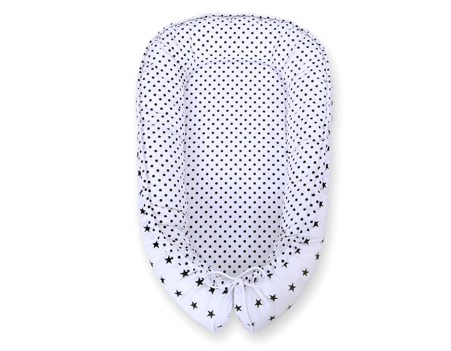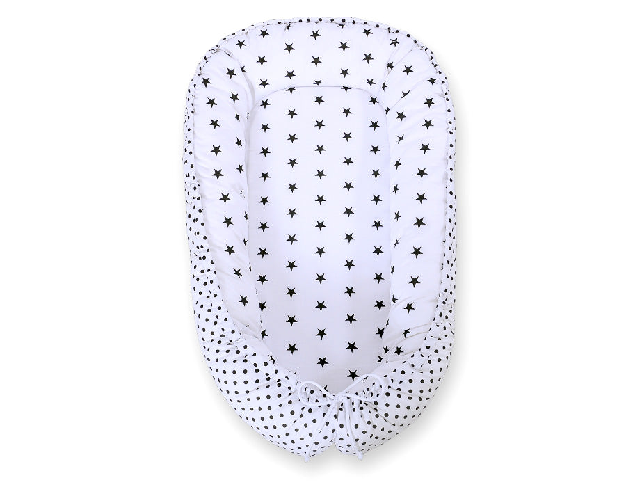 Premium Dubbelzijdig Baby Nest Cocoon BOBONO – Zwarte Sterren/Dots