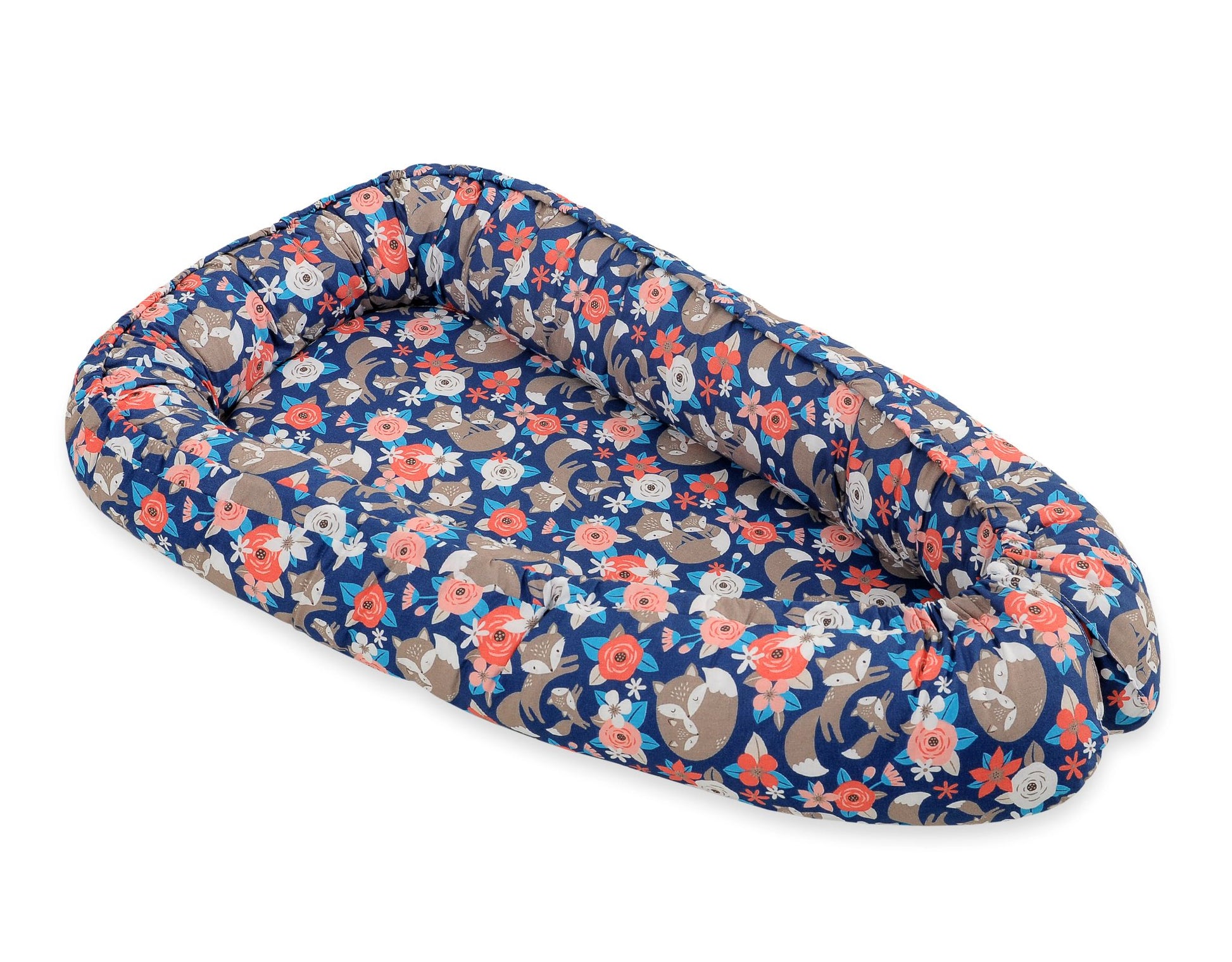 Baby Nest Dubbelzijdige Premium Cocoon voor Baby's - BOBONO "Fox Family" op Blauw