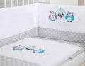Babybedset 135x100 cm met Bumper - 3-delig Grijze Uiltjes met Grijs en Turquoise Borduursel