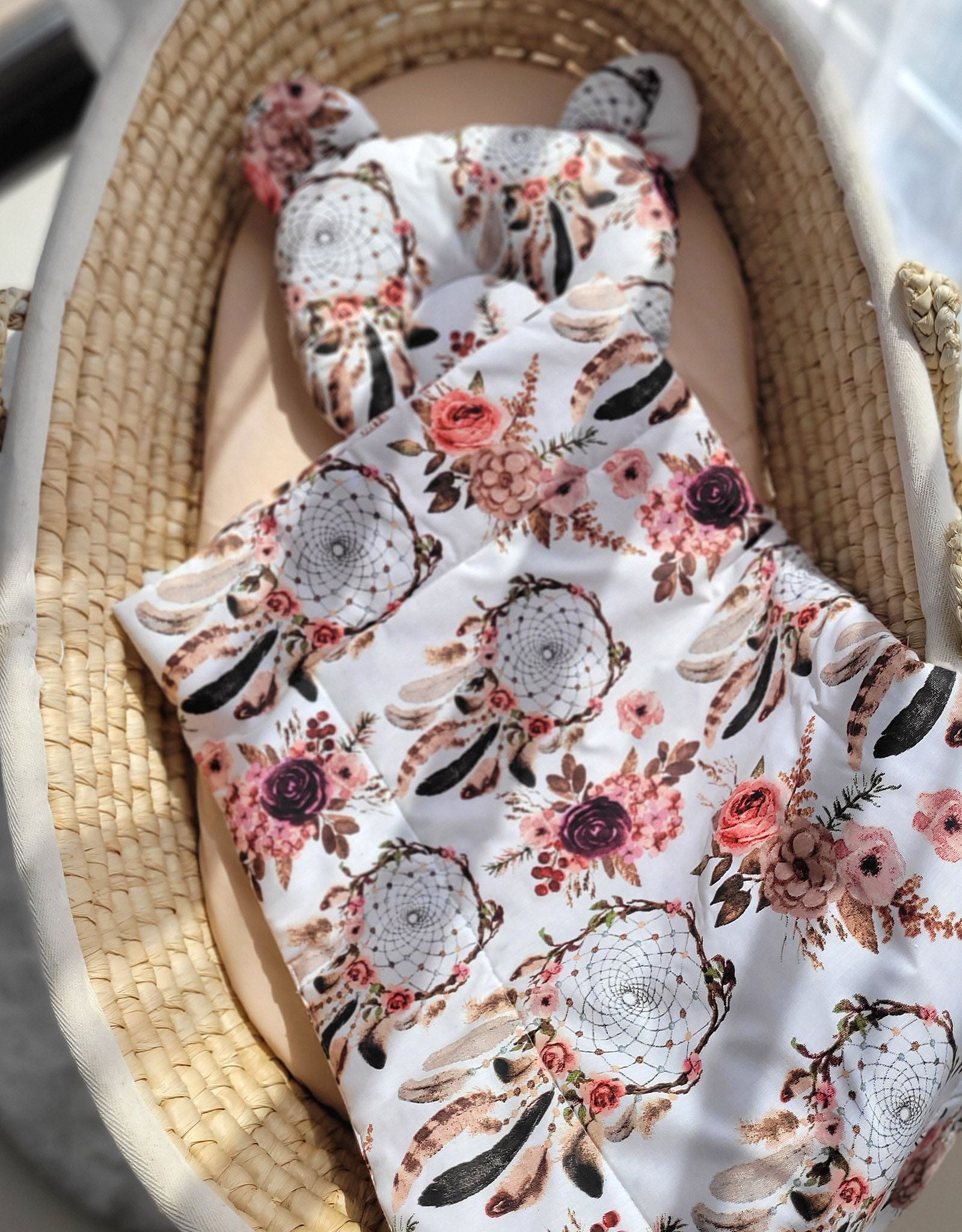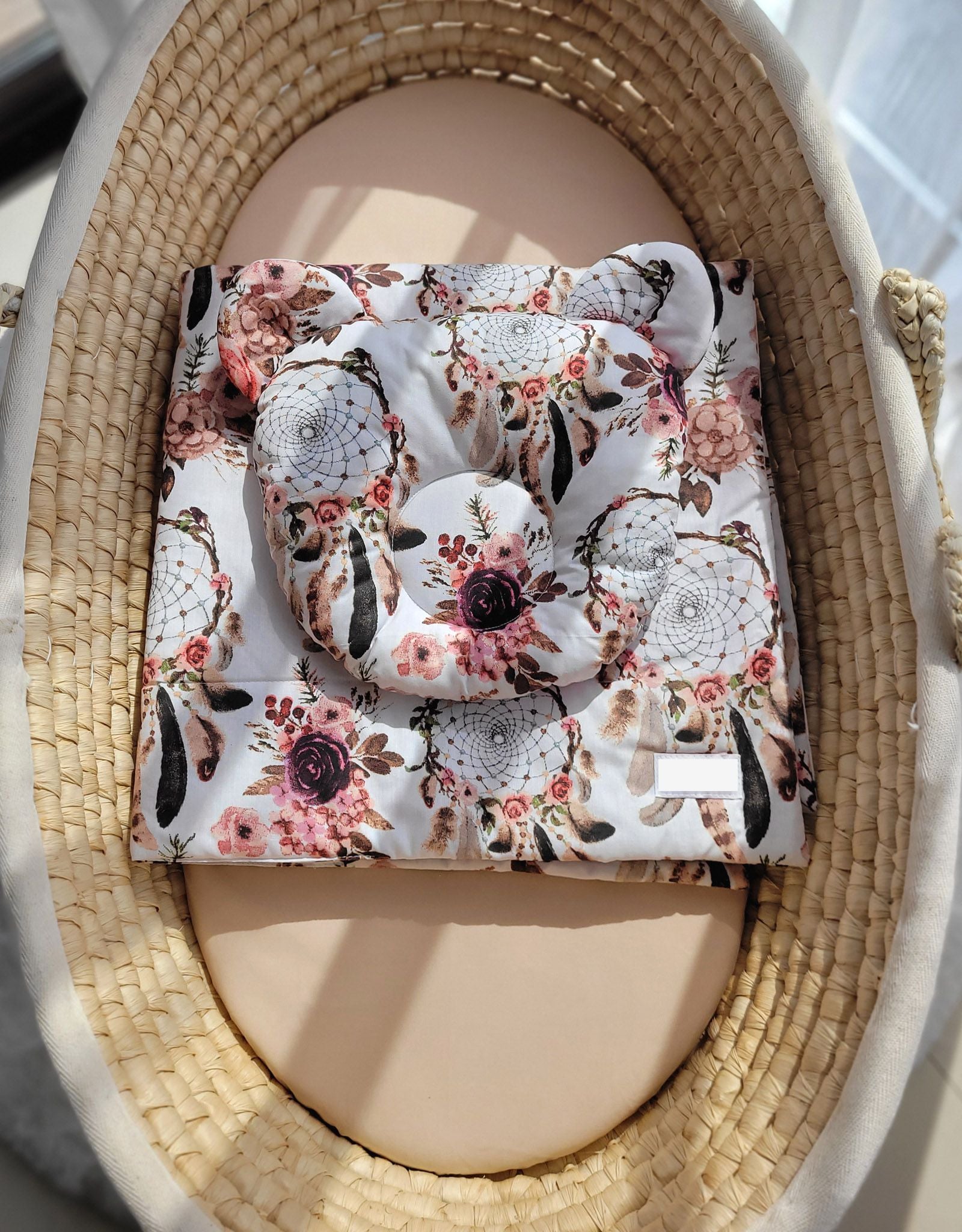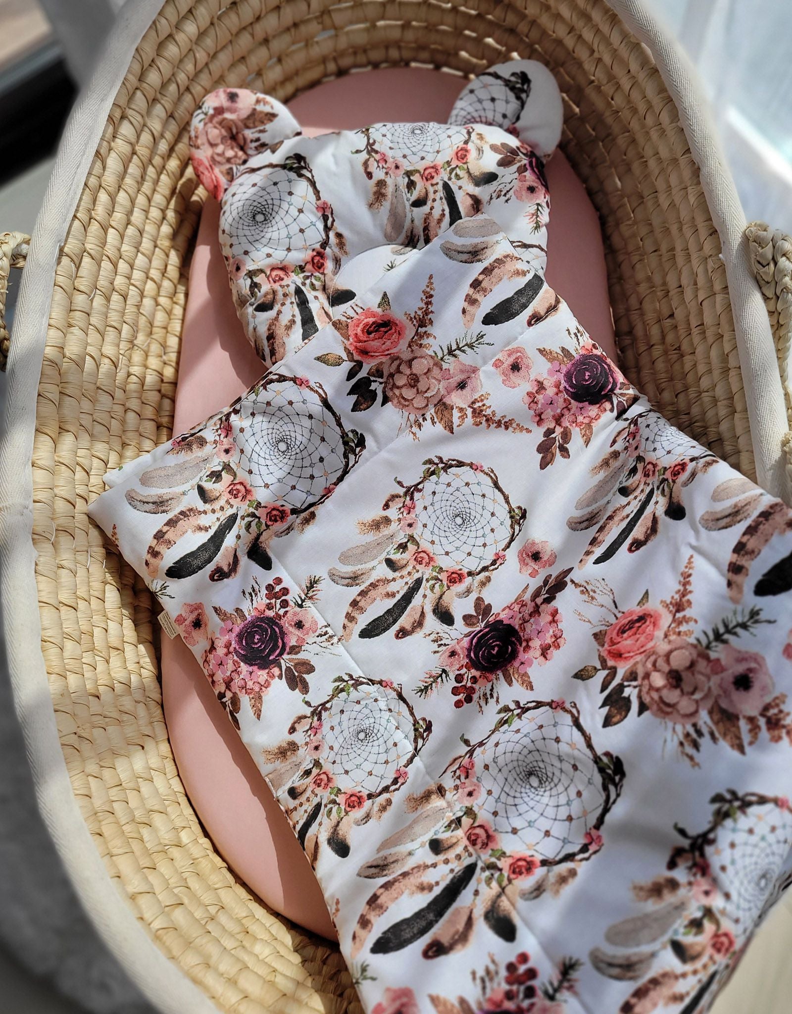 Complete babyset bestaande uit een deken en een teddybeer-kussen, vervaardigd van hoogwaardig, Oeko-Tex gecertificeerd katoen. Perfect voor wieg, wiegmand of kinderwagen, met een zachte vulling zonder optische witmakers die veilig is voor de gevoelige huid van uw baby.