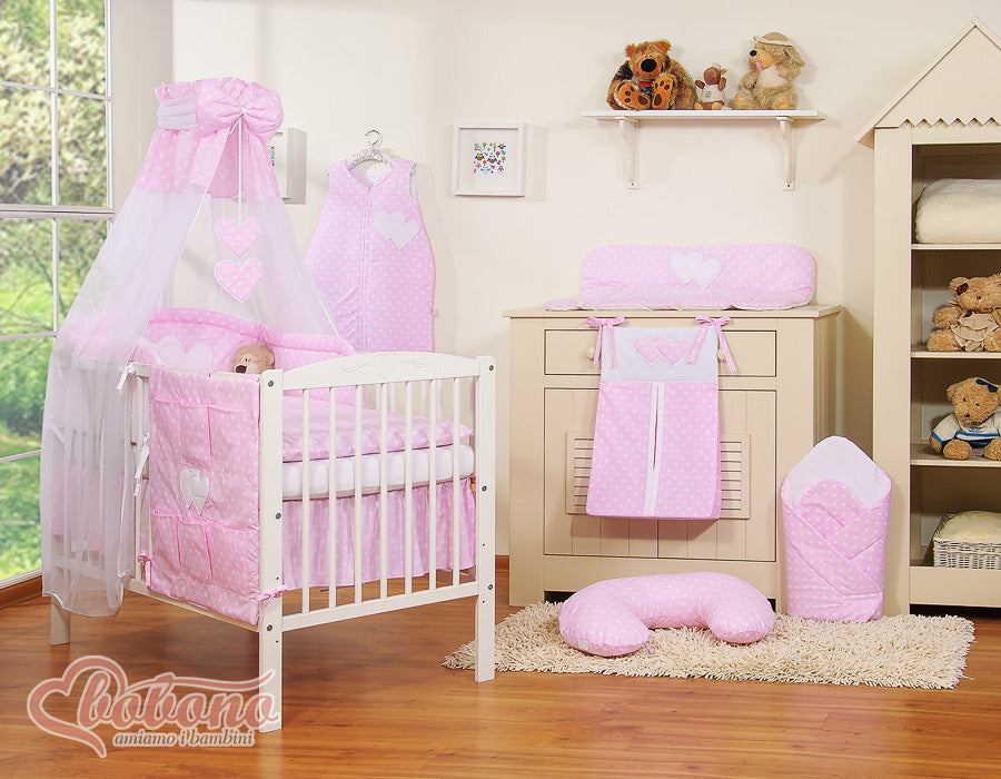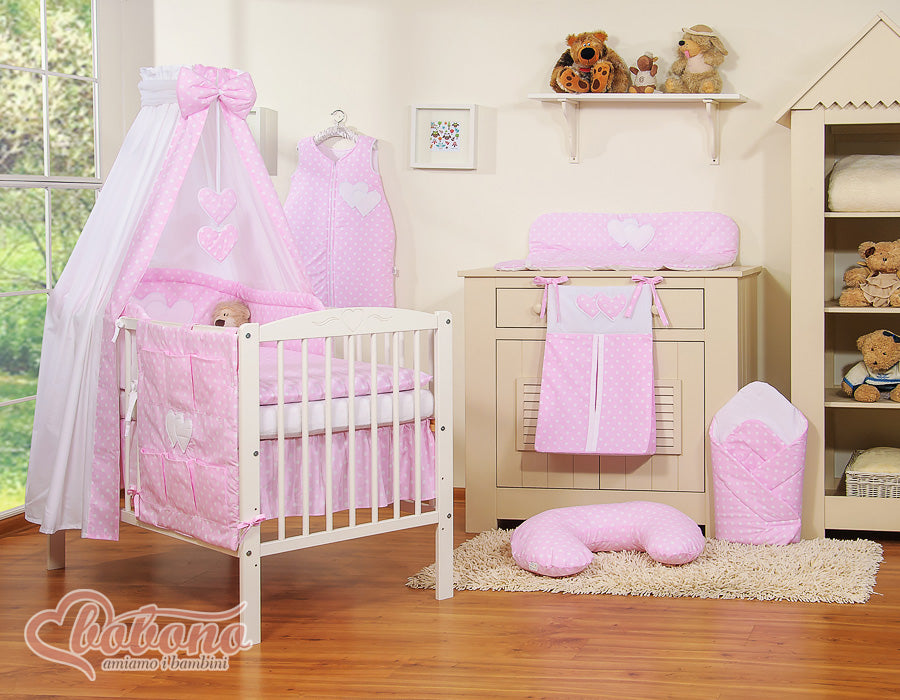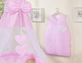 Babylinnen Set 5-delig met Baldakijn - Hanging Hearts Wit met Roze Stippen