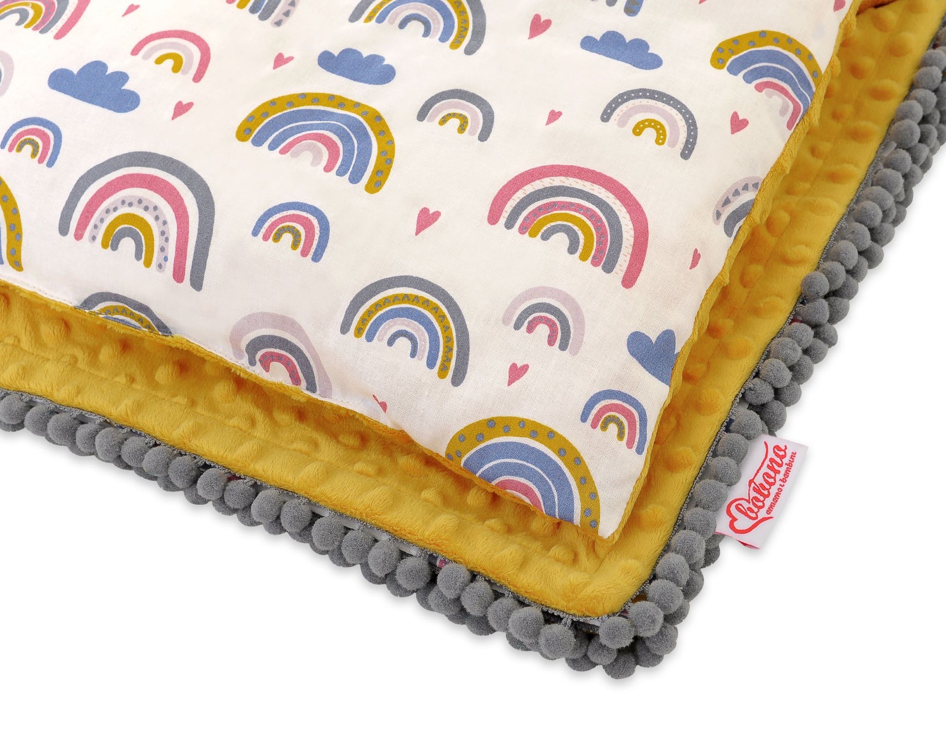 Deze zachte en comfortabele babyset bestaat uit een dubbelzijdige deken en een kussen, gemaakt van minky en 100% katoen, afgewerkt met kleurrijke pompons. Perfect voor onderweg en thuis, biedt het bescherming en warmte voor je kleintje.