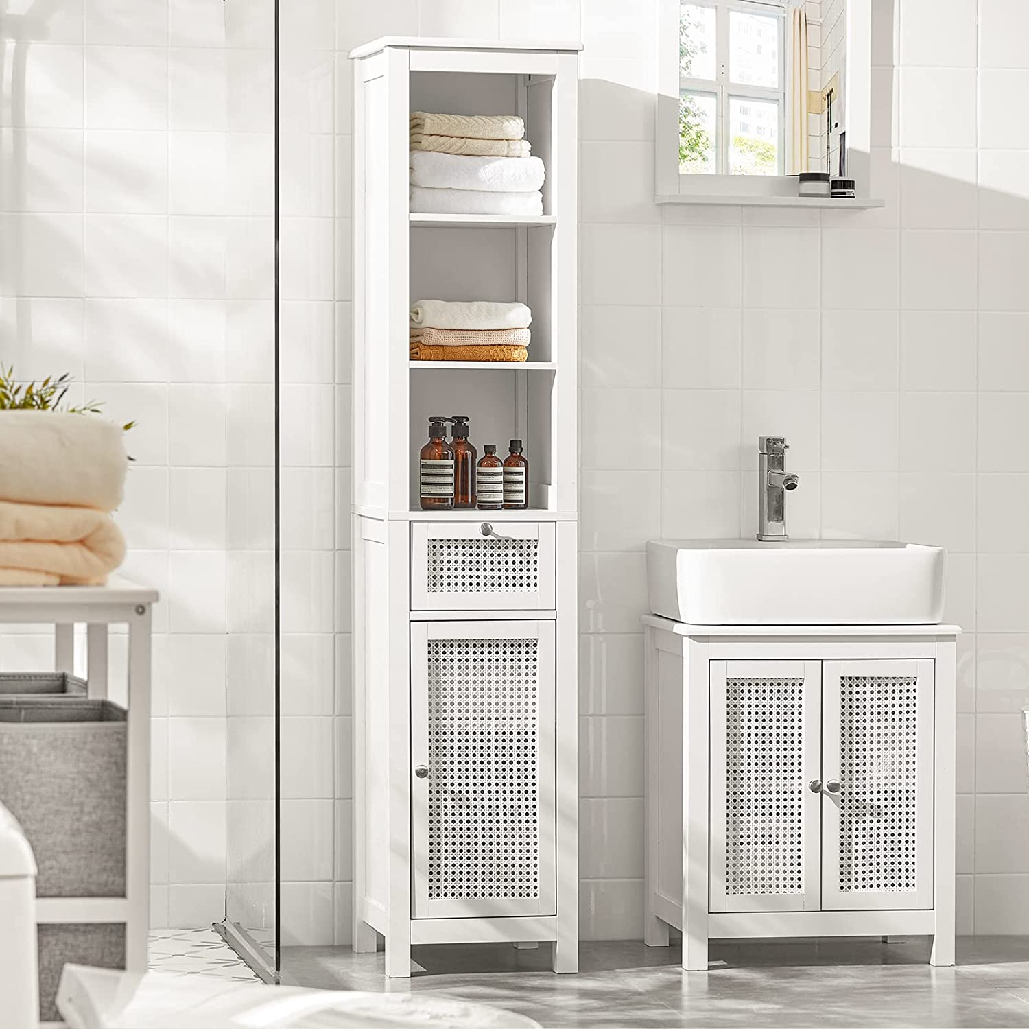Badkamer Hoge Kast - Badkamerkast - Opbergkast met 3 Planken - 1 Lade - 1 Kast