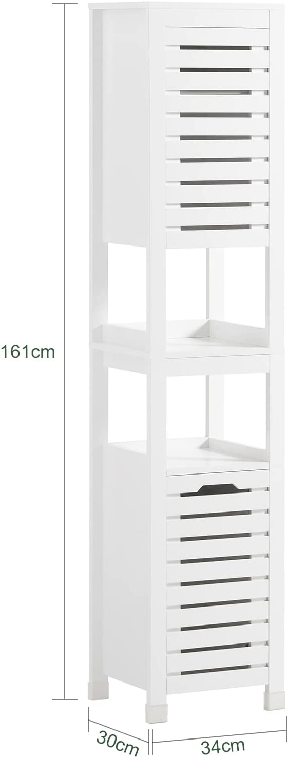 - Deze hoge badkamerkast heeft 2 open planken en 2 kasten met verstelbare planken aan de binnenkant, waardoor je voldoende opbergruimte hebt.