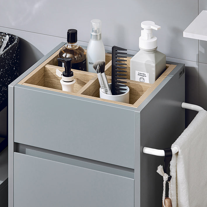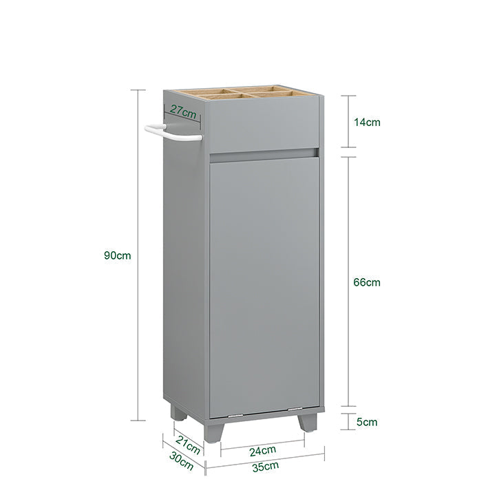 Deze veelzijdige wasopbergkast is gemaakt van duurzame MDF- en PB-materialen en heeft de afmetingen circa 35x90x30cm. De waszak, met een draagvermogen van maximaal 5 kg, is afneembaar. De kast is voorzien van een handige handdoekhouder en vier open planken voor opbergruimte. Elke voet is ontworpen met siliconen voetkussentjes om waterschade te voorkomen.