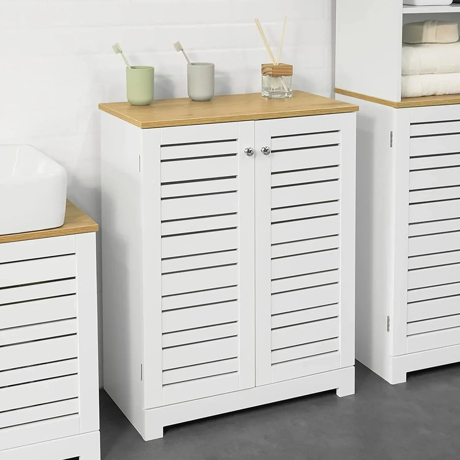 - Het ontwerp van de deuren met lamellen zorgt ervoor dat lucht in en uit kan stromen en voorkomt de vorming van stoom en schimmel binnenin.