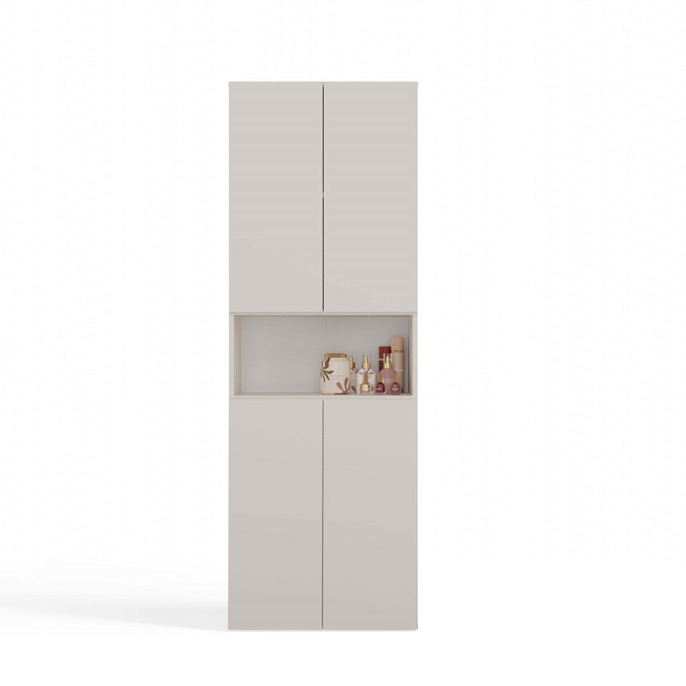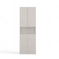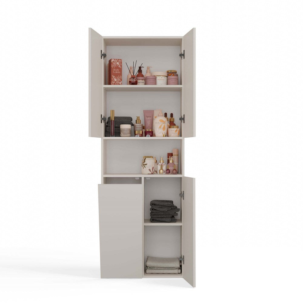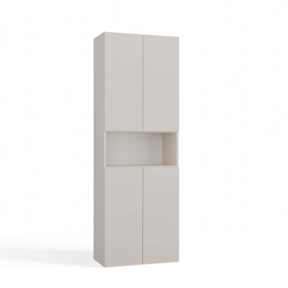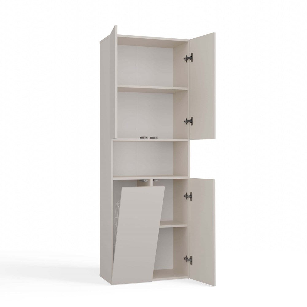 De NEL DK 1K badkamerkast in cashmere (beige tint) is een perfecte keuze voor wie zoekt naar efficiënte opbergruimte in een elegant jasje. Het universele design combineert eenvoud en moderniteit en past moeiteloos in verschillende interieurstijlen. Dankzij de vier deuren, vier gesloten planken, één open plank en een praktische mand heb je volop ruimte om handdoeken, ondergoed en andere badkamerbenodigdheden netjes op te bergen. Het tip-on deuropeningssysteem zonder handgrepen zorgt daarbij voor extra gebruiksgemak en een strakke uitstraling.