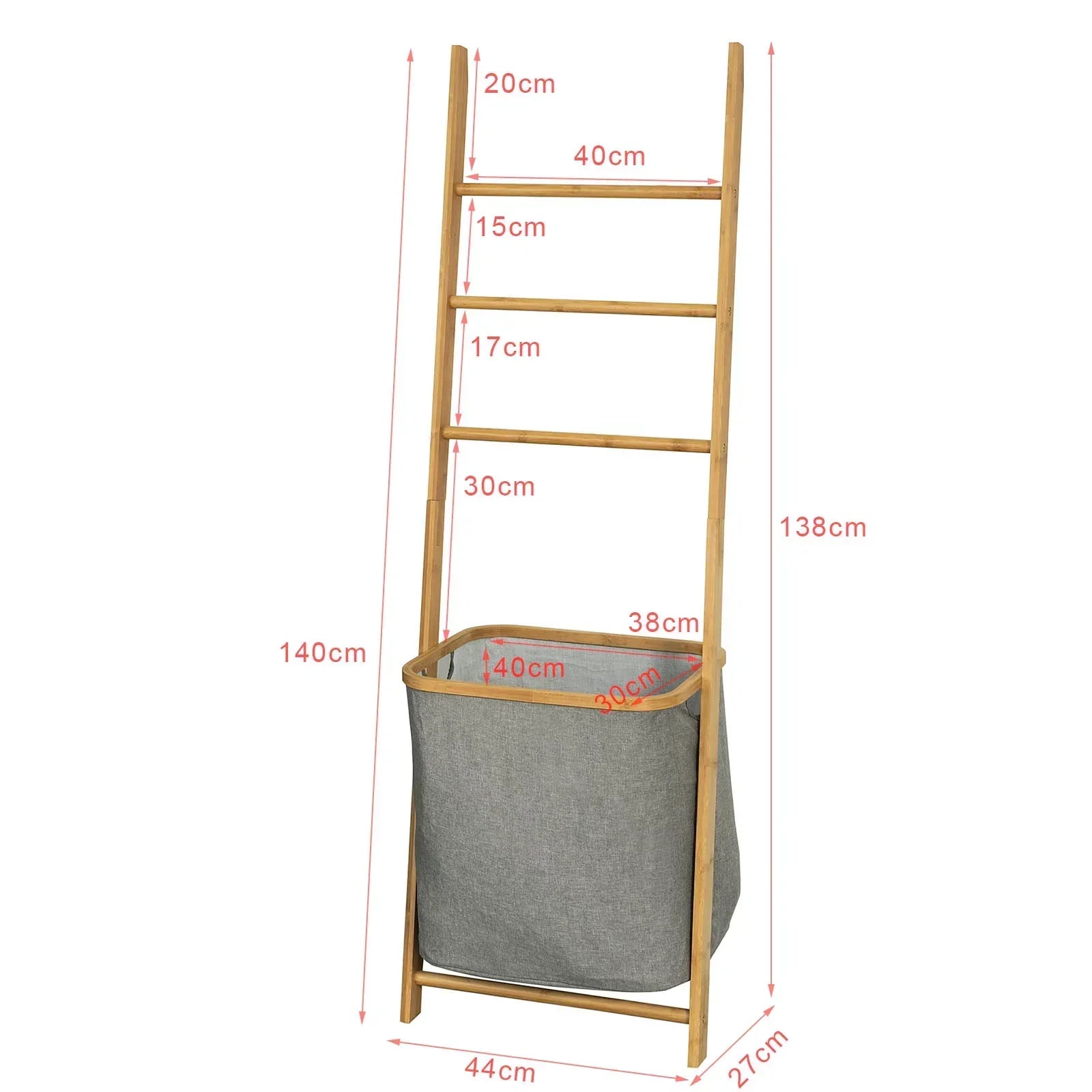 Details: Badkamerplank in ladderstijl met 3 ophangrails en afneembare wasmand is een goede keuze voor uw badkamer. 3 ophangrails zijn geschikt voor handdoeken. Het grote mandoppervlak biedt voldoende opbergruimte voor uw wasgoed of handdoeken. Gemaakt van bamboe met gelakte coating. Wasmand is gemaakt van polyester linnenachtige stof. Natuurlijk bamboe, glad oppervlak, elegante uitstraling, goede aanvulling op uw huis. Modieuze uitstraling, dus past perfect bij elke woonstijl. Productdetails Materiaal: Bamboe, stof. Afmetingen: B44 x D27 x H138cm. Gewicht: 2,5 kg. Draagvermogen: 20 kg. Het artikel wordt geleverd in een platte verpakking en vereist zelfmontage. Gedetailleerde instructies meegeleverd. De decoratieve elementen zijn niet bij de levering inbegrepen. Neem per e-mail contact met ons op als u vragen heeft. We zullen zo snel mogelijk antwoorden.