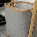 - Gemaakt van bamboe met gelakte coating. Wasmand is gemaakt van polyester, linnenachtige stof.