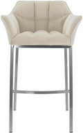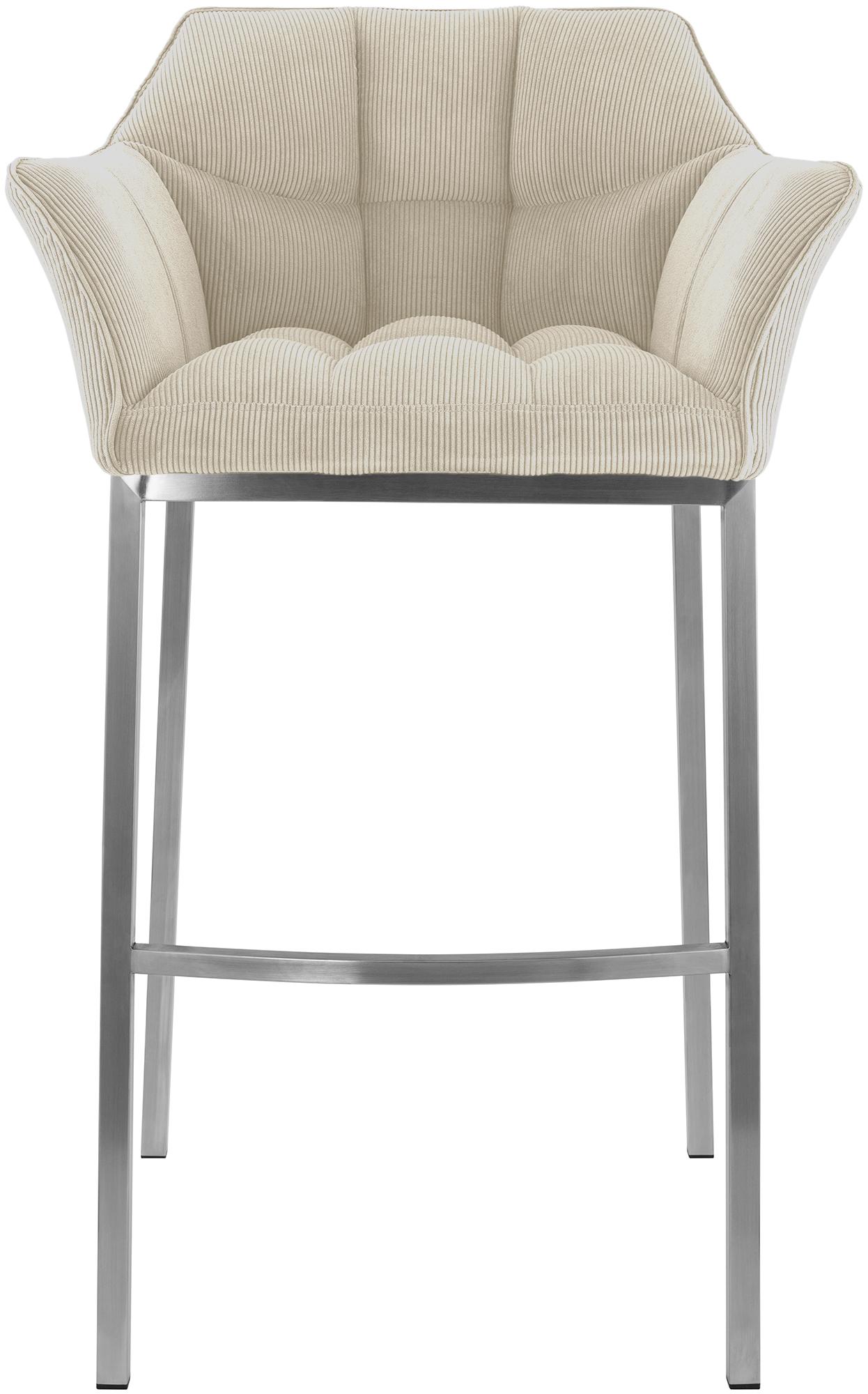 De barkruk onderscheidt zich door de elegante combinatie van luxueuze cordbekleding en een metalen vierpootsframe.