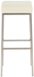 Deze barkruk valt op door zijn tijdloze combinatie van een vierkante, gestoffeerde zitting en een metalen frame met vier poten.