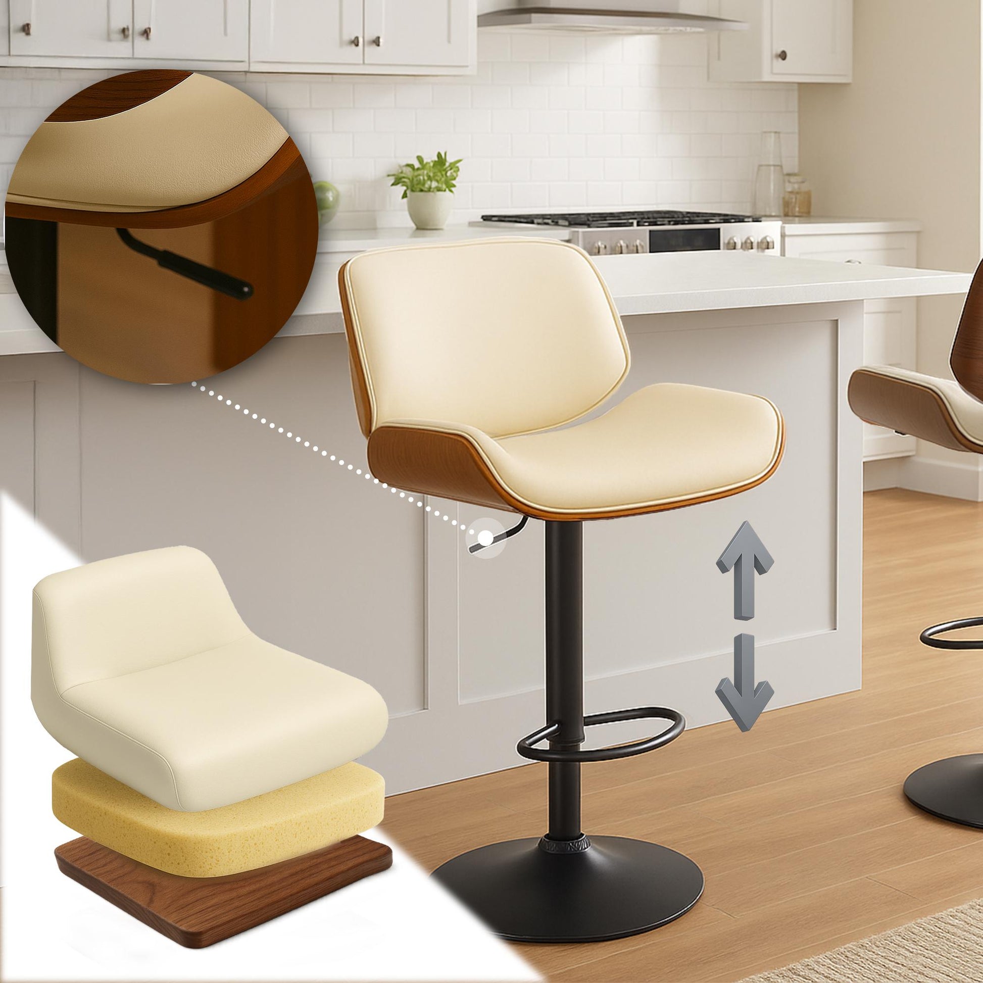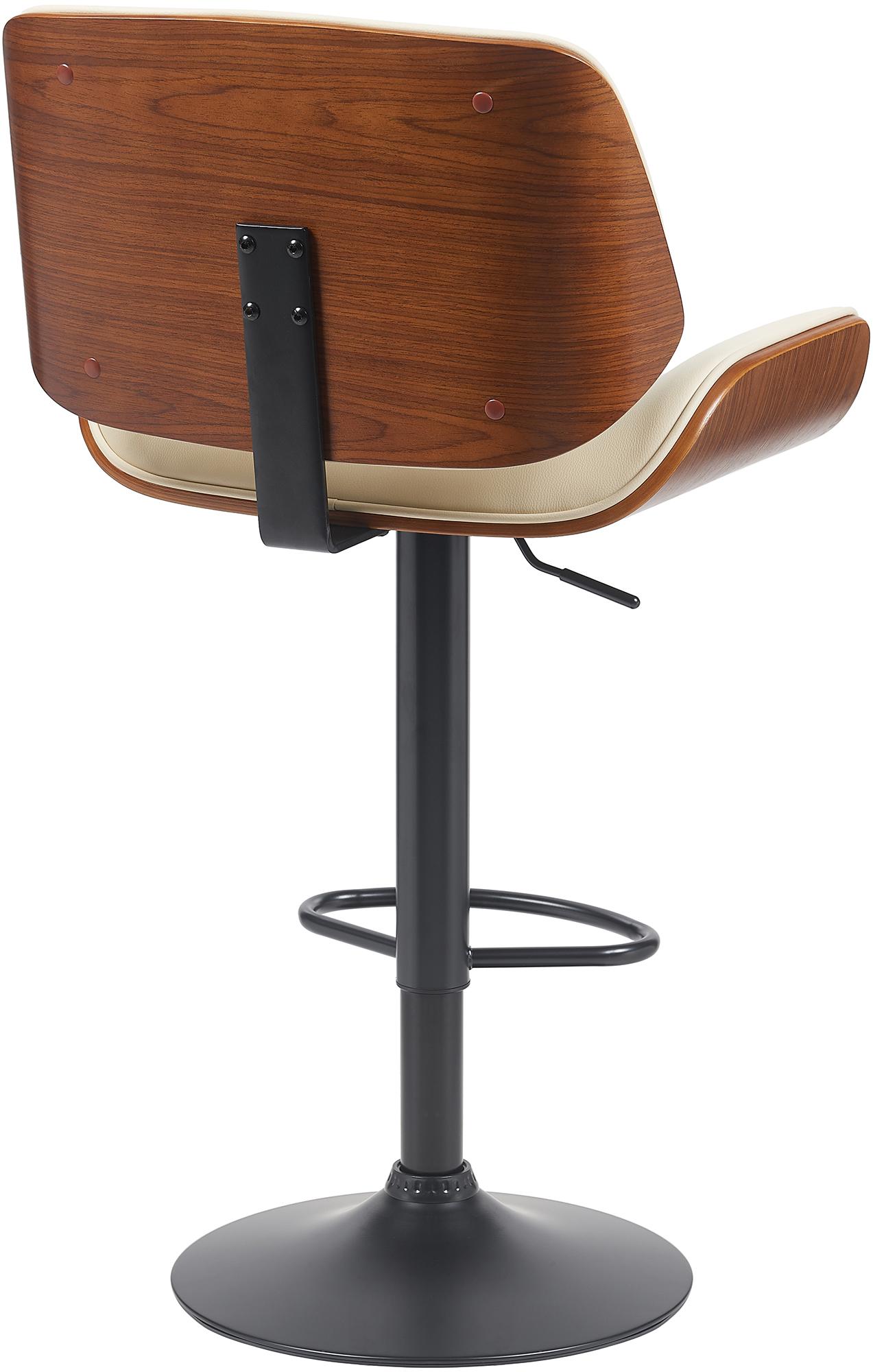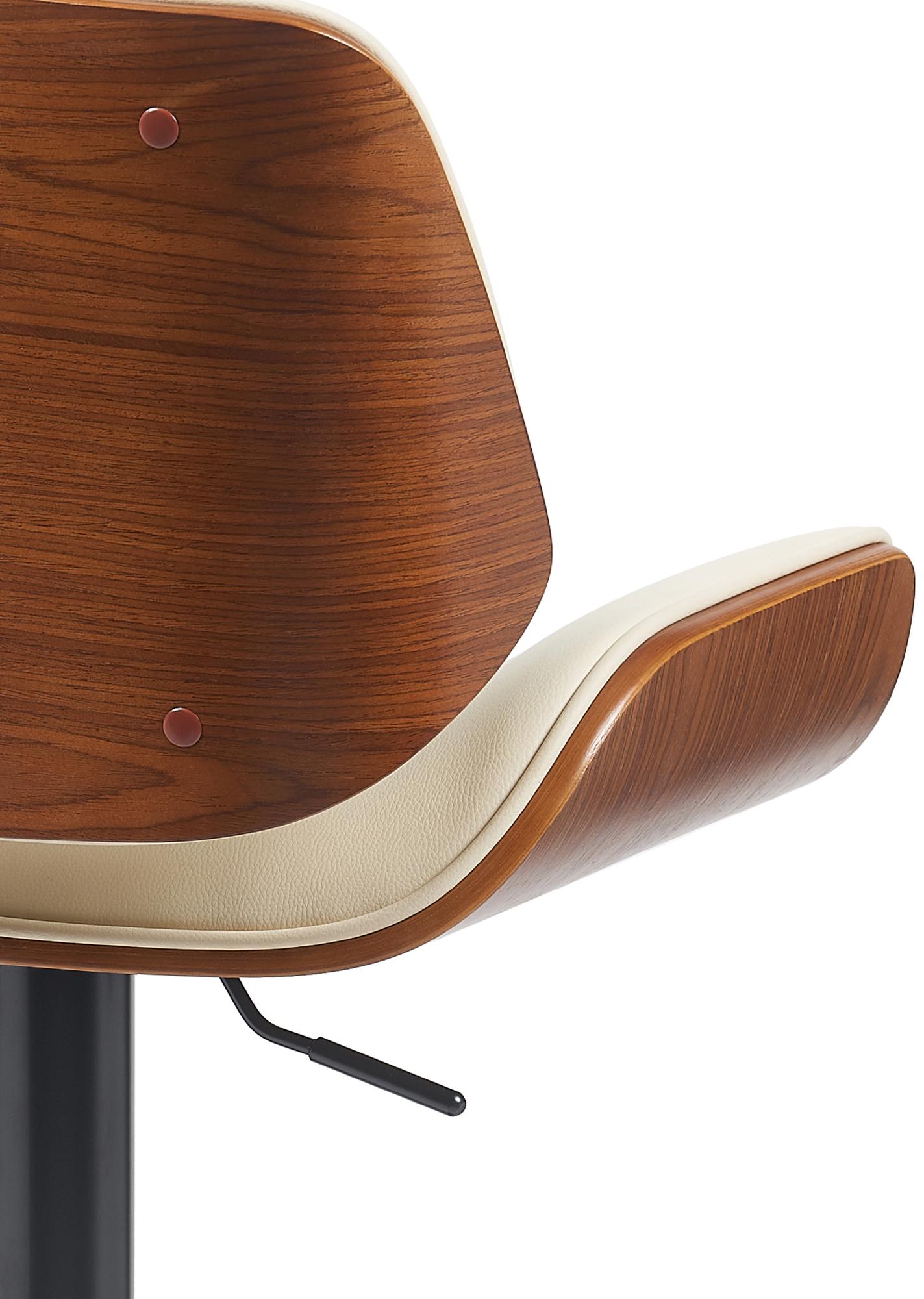 Deze barkruk combineert modern design met hoge functionaliteit. De zitting is vervaardigd van geperst gebogen hout in een elegante walnoot-uitstraling en bekleed met hoogwaardig kunstleer. De ergonomisch ontworpen rugleuning biedt extra zitcomfort, zelfs voor langere periodes.