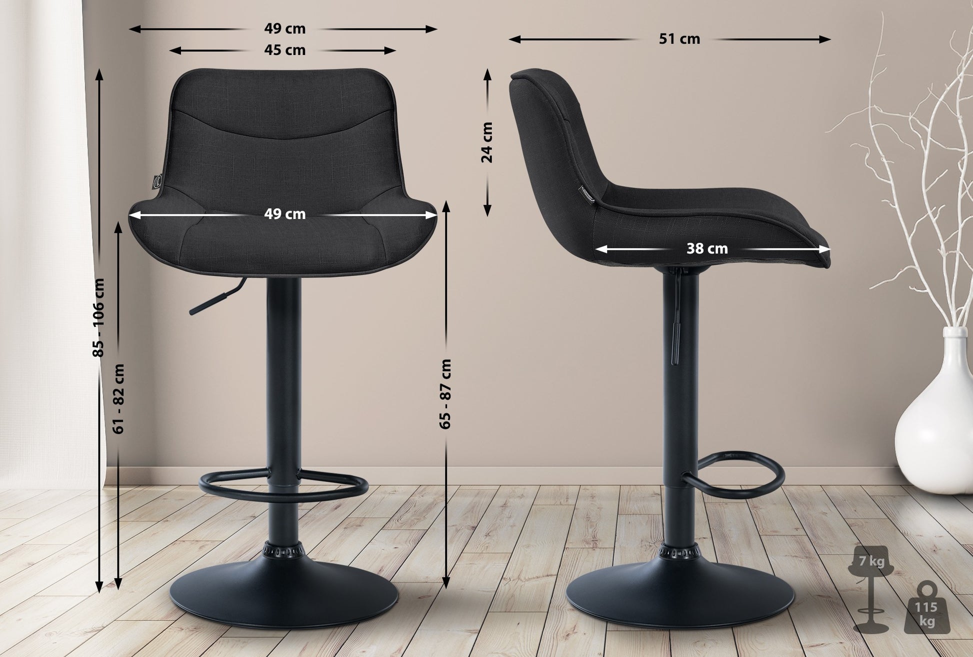 Het metalen frame en de trompetvoet zorgen voor stabiliteit en duurzaamheid. De geïntegreerde voetsteun past zich aan de zithoogte aan en biedt extra ondersteuning. De stoffen bekleding is duurzaam en zit comfortabel. Vloerbeschermers beschermen tegen krassen.