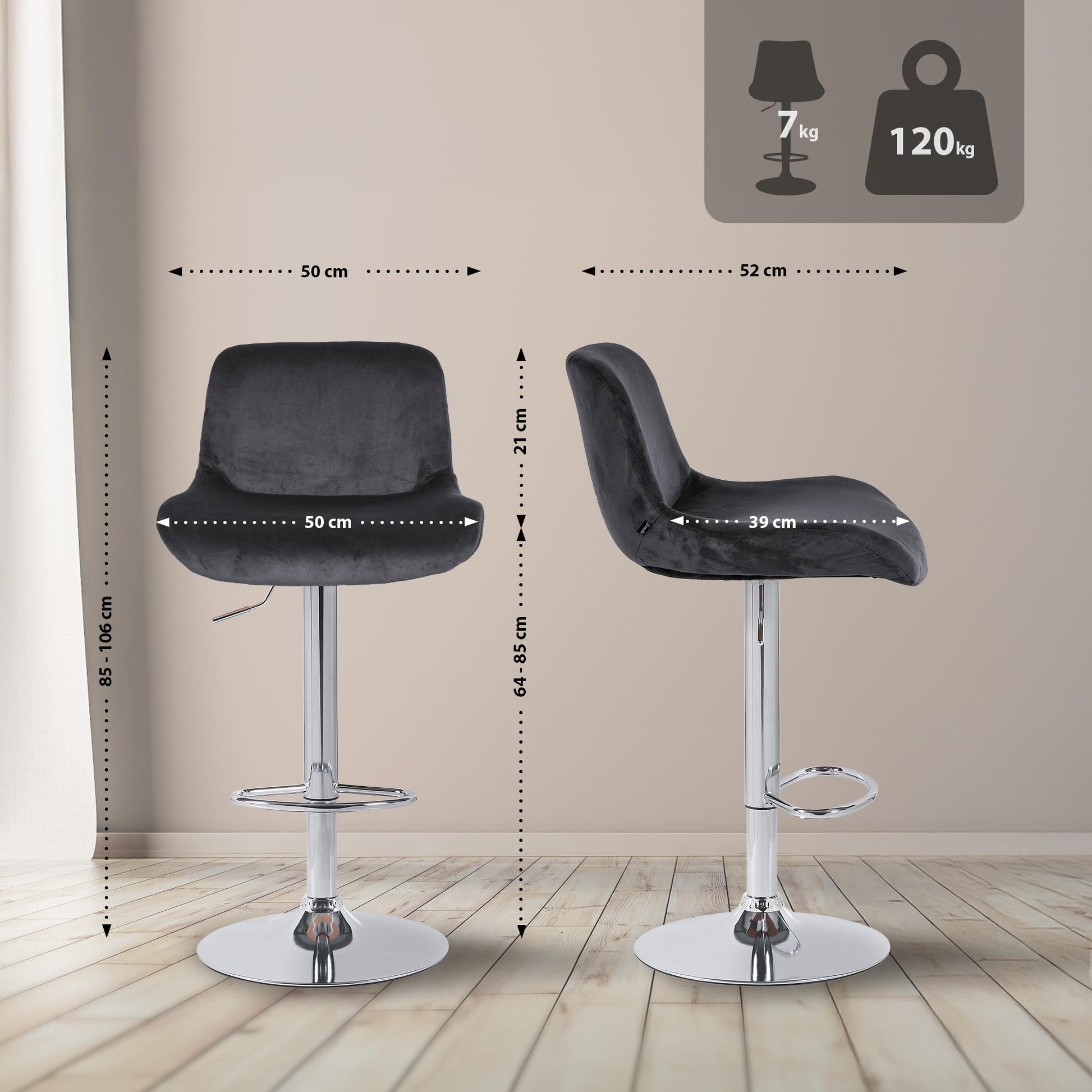 Het metalen frame heeft een chroomlook en de stijlvolle bekleding zorgt voor een elegante uitstraling. De zitting is naar keuze bekleed met slijtvaste stof of luxueus fluweel. Het metalen frame is in hoogte verstelbaar en de 360 graden draaifunctie biedt veel bewegingsvrijheid.