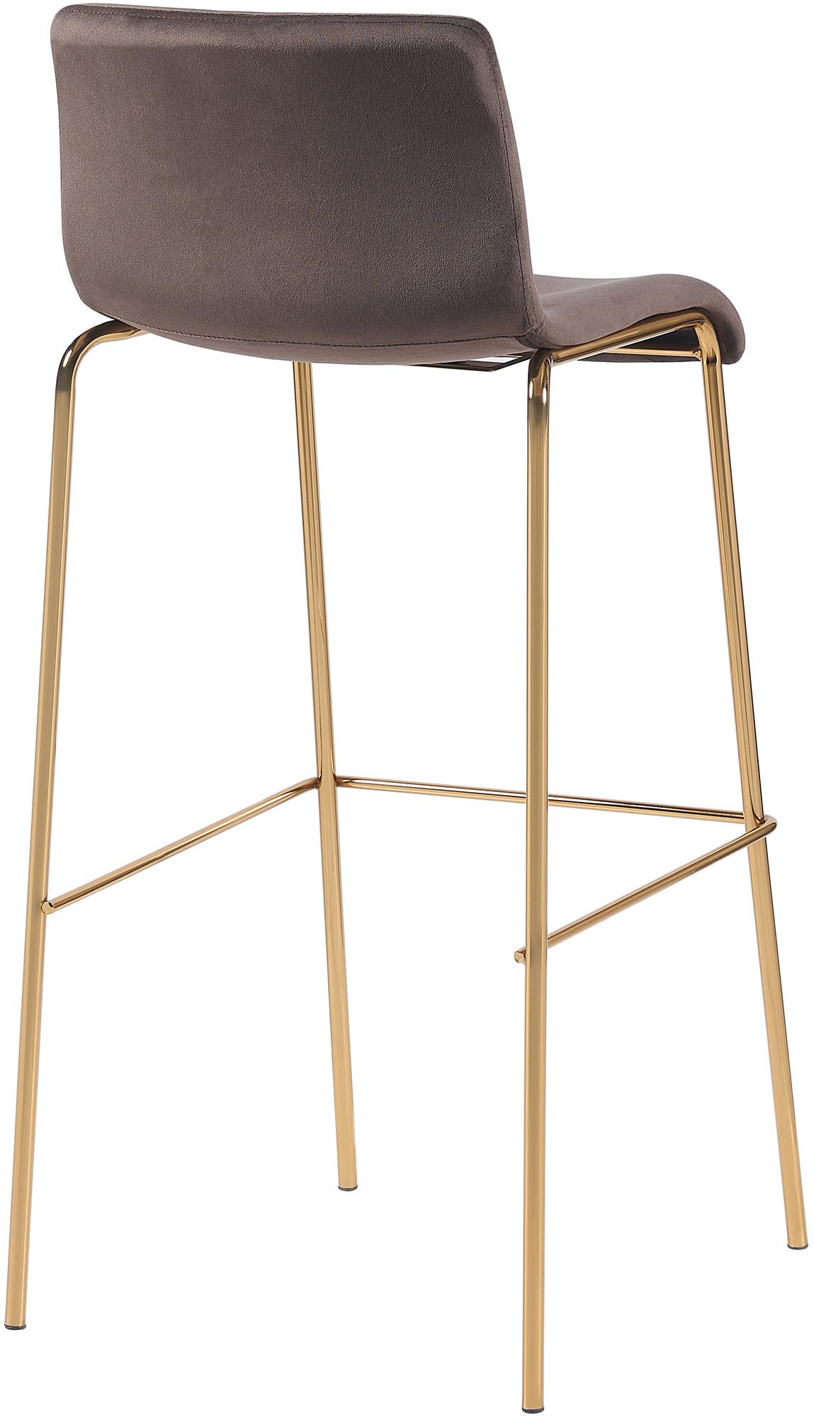 De kruk heeft een elegant uiterlijk dankzij de combinatie van fluweelachtige bekleding en het glanzende, goudkleurige frame.