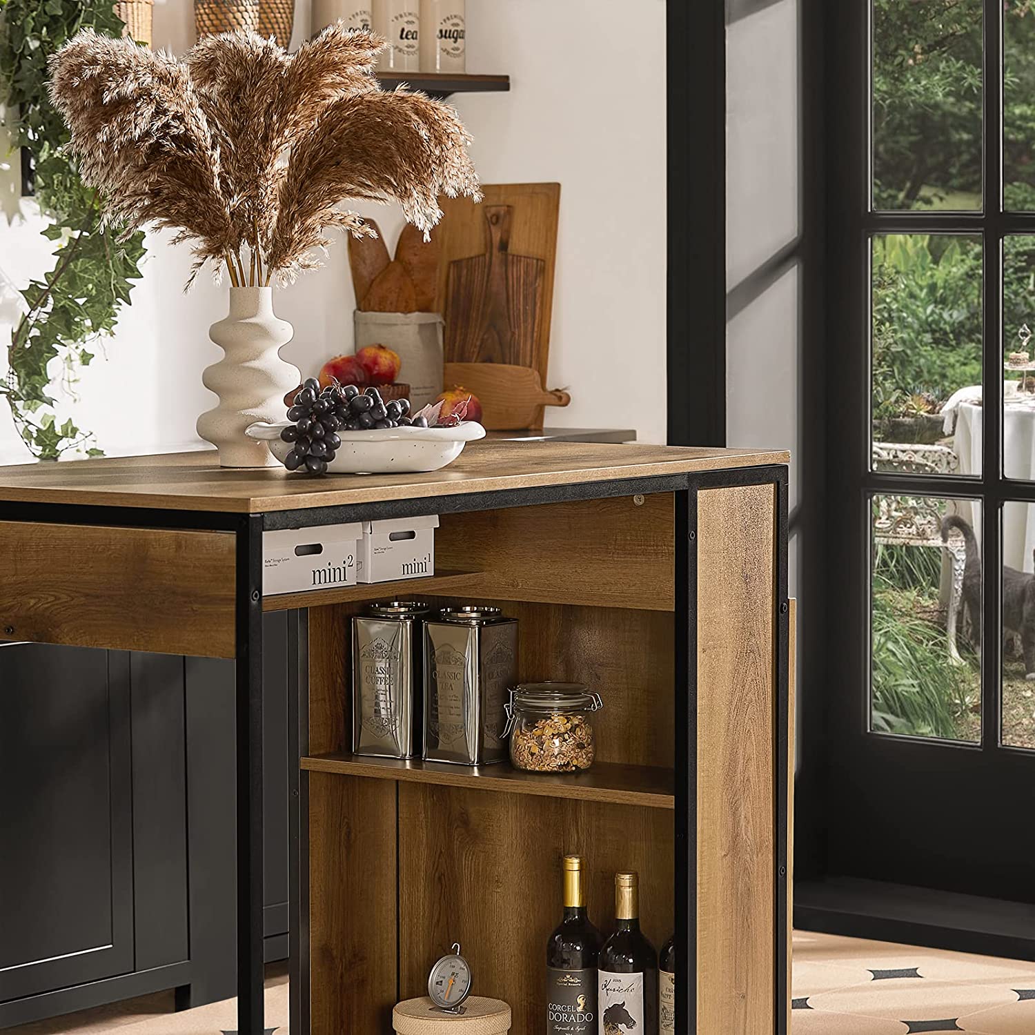 - Gemaakt van hoogwaardig spaanplaat met houteffect en stalen frame met zwarte poedercoating.
