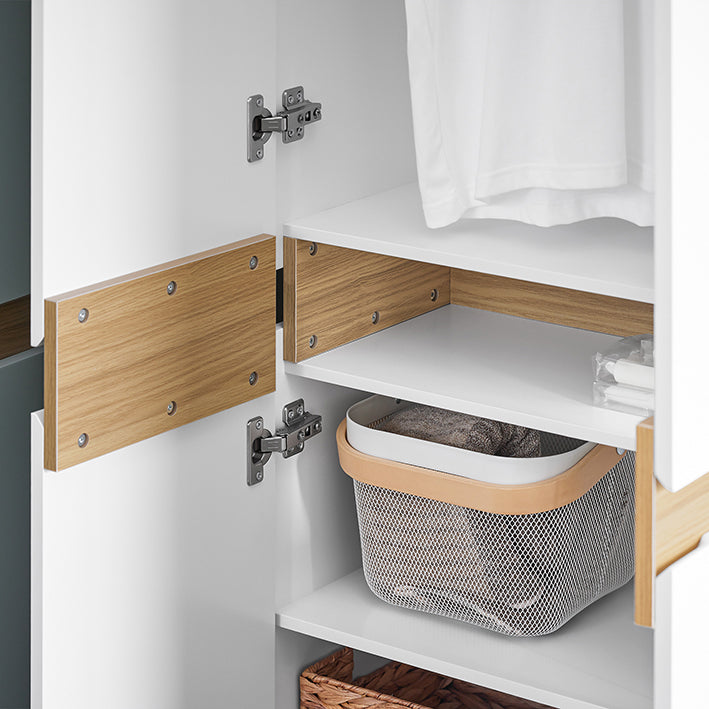 De multifunctionele garderobekast is een veelzijdige opbergoplossing gemaakt van duurzaam MDF (E1). Met 5 vakken achter 2 deuren biedt hij voldoende opbergruimte voor diverse spullen. De verstelbare planken maken maatwerk mogelijk op basis van verschillende itemhoogtes. De kast is uitgerust met kantelbeveiligingen en zorgt voor stabiliteit en veiligheid. Combineer met het bijpassende bankje en de wandkapstok om je set compleet te maken.
