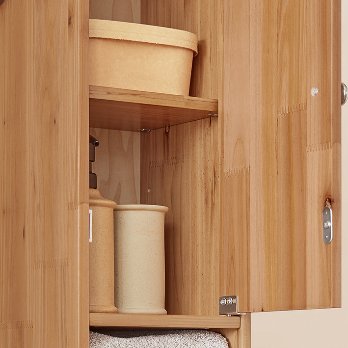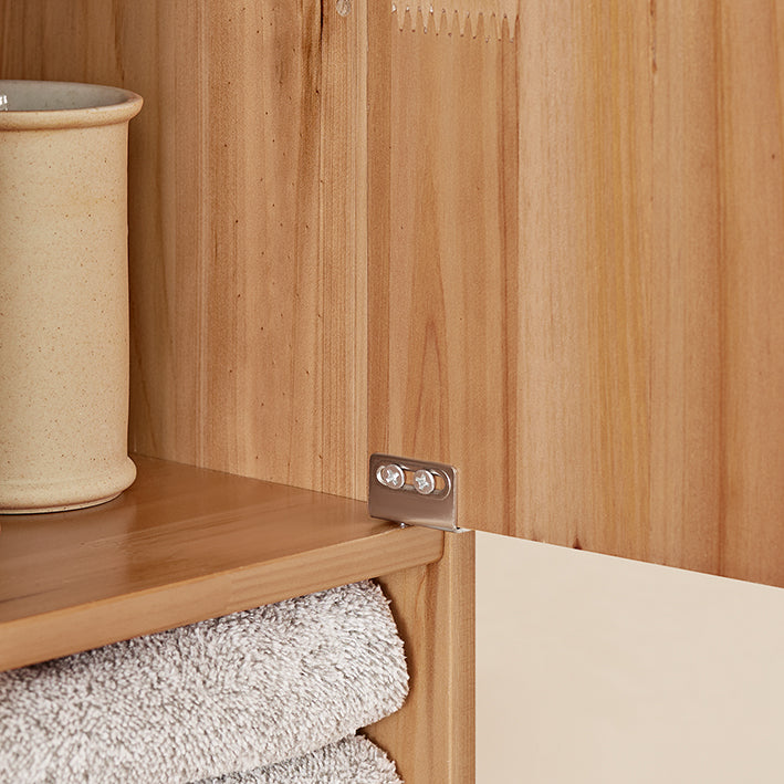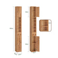 Het badkamermeubel is gemaakt van milieuvriendelijk cederhout, perfect voor kleine hoekjes met afmetingen van 20x180x20cm. De kast is veilig dankzij het kantelveilige beslag en de antislip kunststof voetjes.