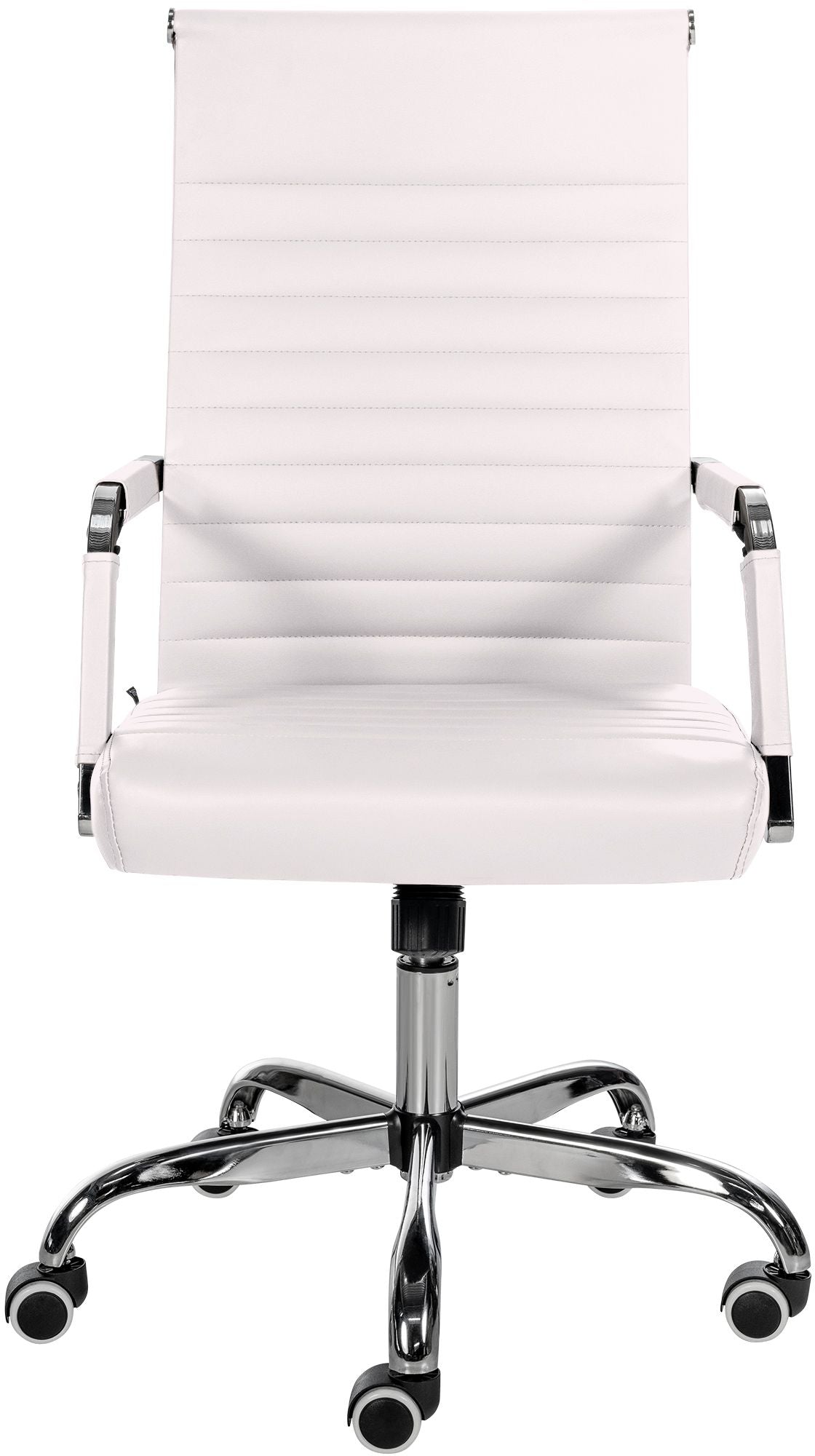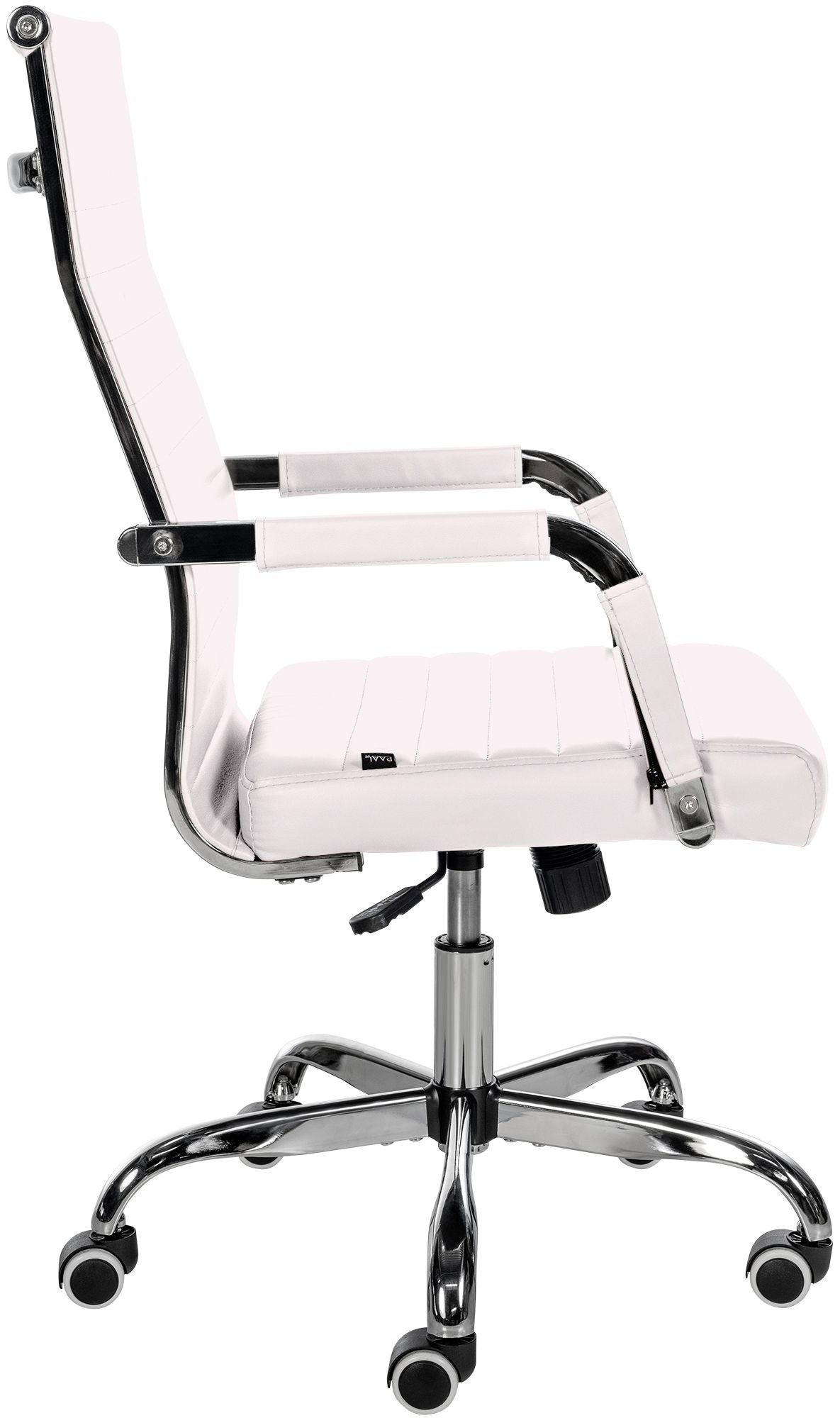 Deze stoel overtuigt niet alleen met zijn moderne uitstraling, maar ook qua comfort. De hoogwaardige en onderhoudsvriendelijke kunstlederen bekleding zorgen voor een aangename zitervaring, zelfs gedurende meerdere uren. Bovendien is de zithoogte traploos instelbaar voor ergonomisch zitten. De stoel heeft ook een kantelmechanisme voor meer bewegingsvrijheid. Stabiliteit wordt gegarandeerd door het metalen frame in chroomlook. Met vijf soepel lopende wielen kun je makkelijk en soepel over de vloer bewegen, ongeacht de ondergrond. Het elegante verchroomde frame en de stabiele, gebogen armleuningen met kunstlederen bekleding maken het geheel af.