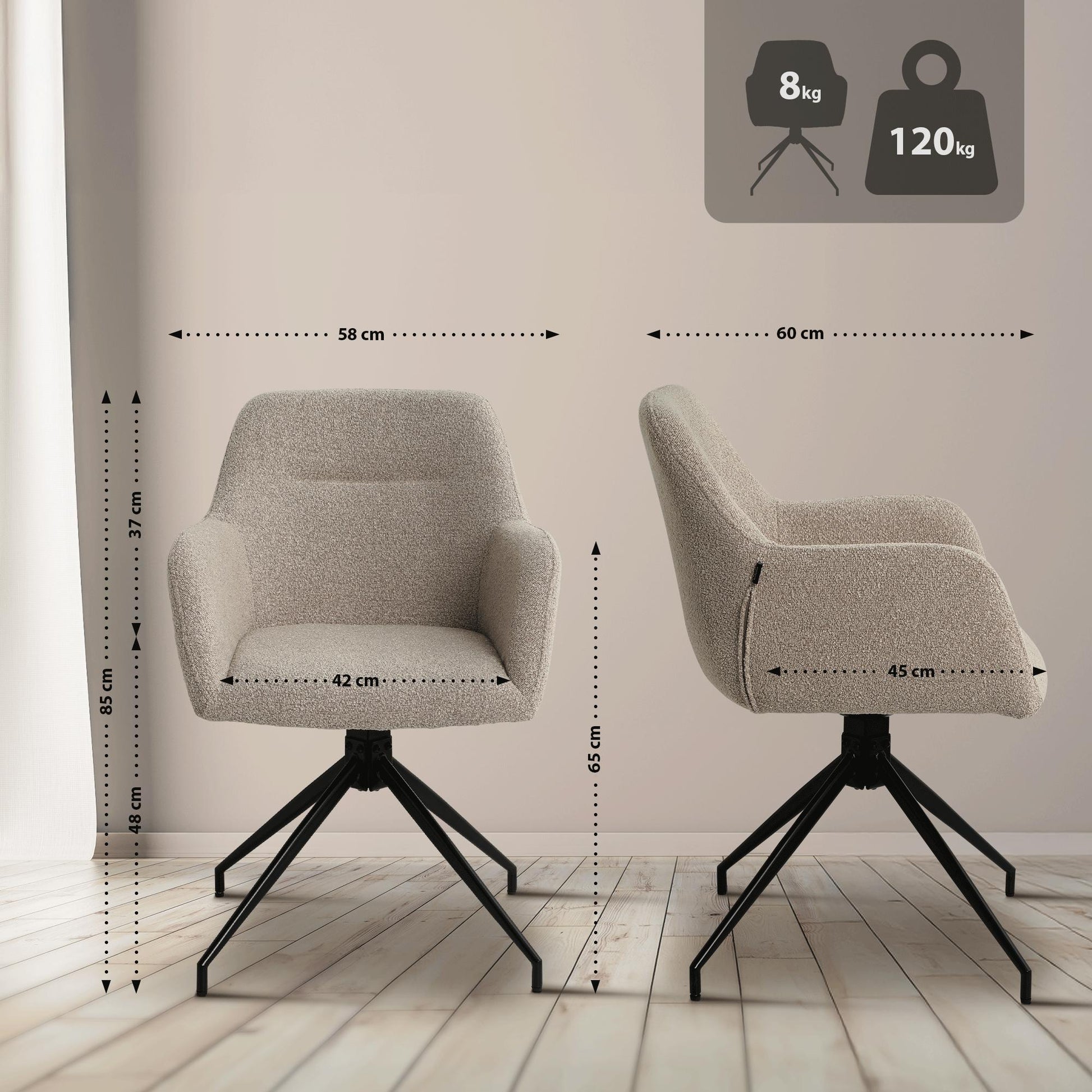 Het stevige en gepoedercoate metalen frame biedt uitstekende stabiliteit tot een belasting van 120 kg en staat garant voor duurzaamheid. De zachte bekleding van behaaglijke teddystof biedt niet alleen optimaal zitcomfort, maar is bovendien gemakkelijk te onderhouden. Slim geïntegreerde armleuningen zorgen voor extra ontspanning aan de eettafel.