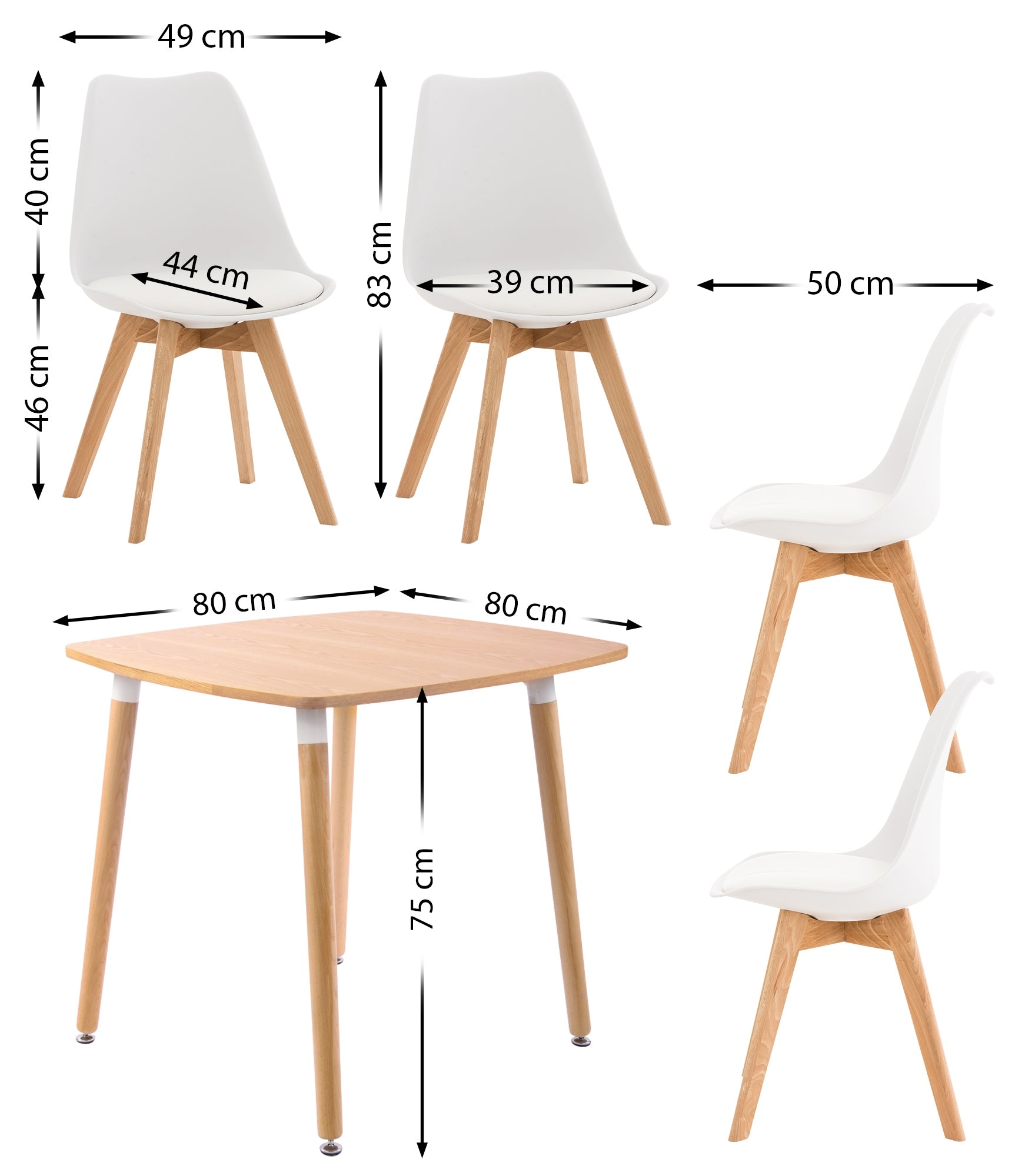 De stoelen hebben een stevige kunststof zitting met een rugleuning die de rug ontlast. Het zitkussen, bekleed met onderhoudsvriendelijk imitatieleer, verhoogt het comfort. Zowel de tafel als de stoelen zijn uitgerust met vloerbeschermers om schade aan kwetsbare vloeren te voorkomen.