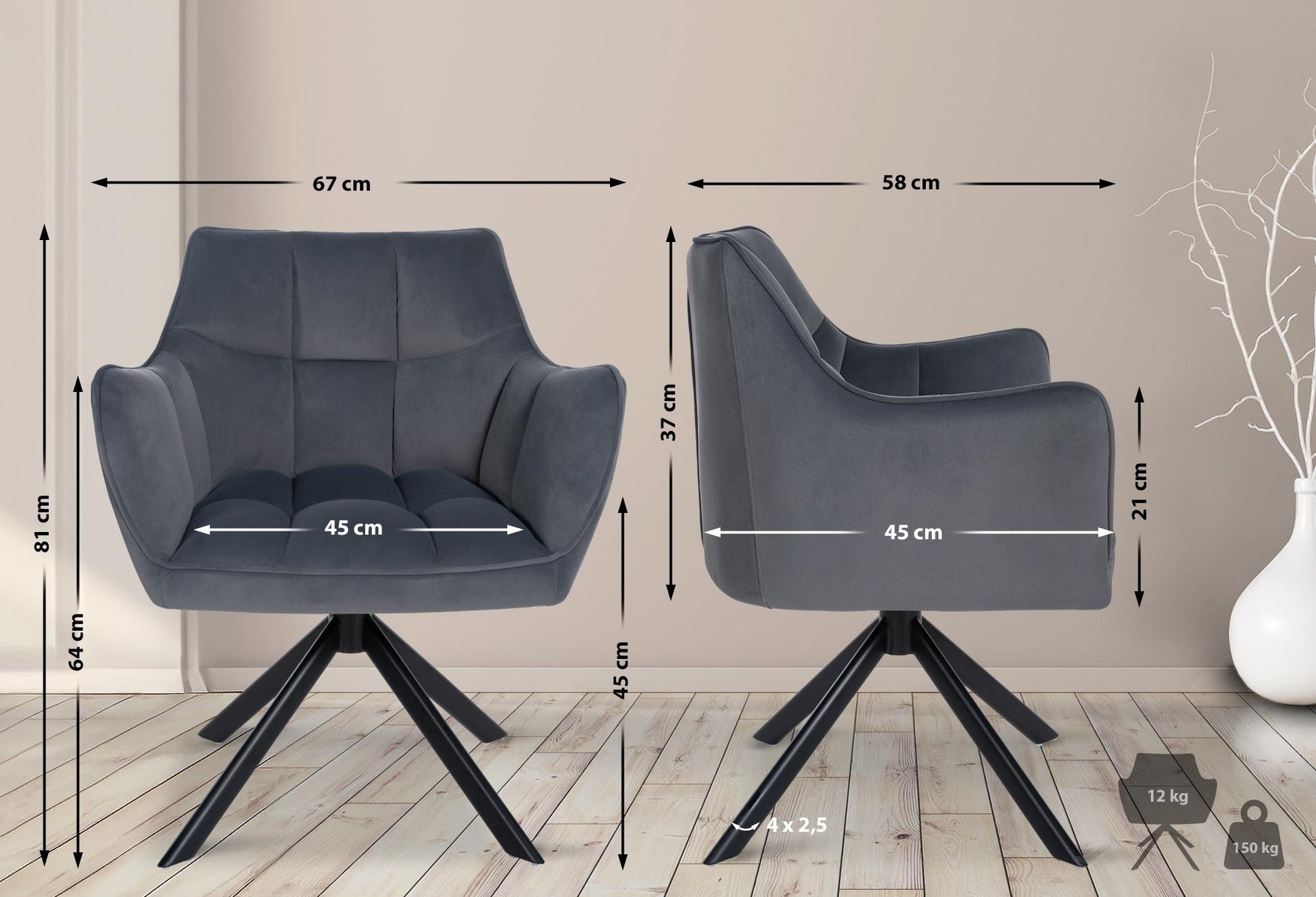 De ruime bekleding loopt door over de zitting, armleuningen en rugleuning van de stoel voor hoog zitcomfort. Het stabiele vierpotige frame van hoogwaardig roestvrij staal is verkrijgbaar in zwart of zilver en beschikt over een handige draaifunctie. Hierdoor kan de zitschaal 90 graden naar rechts en links draaien en keert terug naar de beginpositie wanneer je opstaat. Vloerbeschermers beschermen gevoelige vloeren tegen krassen.