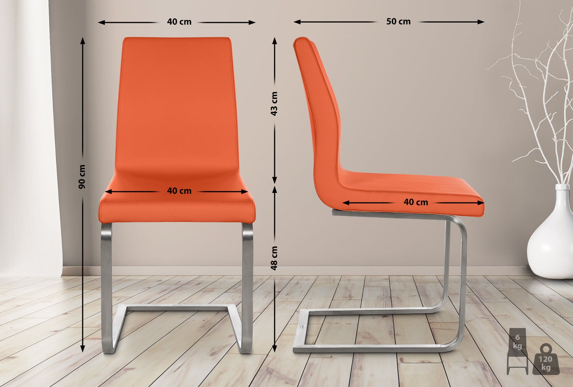 Het robuuste frame van geborsteld roestvrij staal verzekert zowel duurzaamheid als stabiliteit. De zitting en de rugleuning, bekleed met kunstleer, zijn hoogwaardig gevuld voor optimaal zitcomfort. Met een ergonomische rugleuning wordt een natuurlijke zithouding ondersteund en de druk op de onderrug verminderd, wat gunstig is tijdens langdurig zitten.