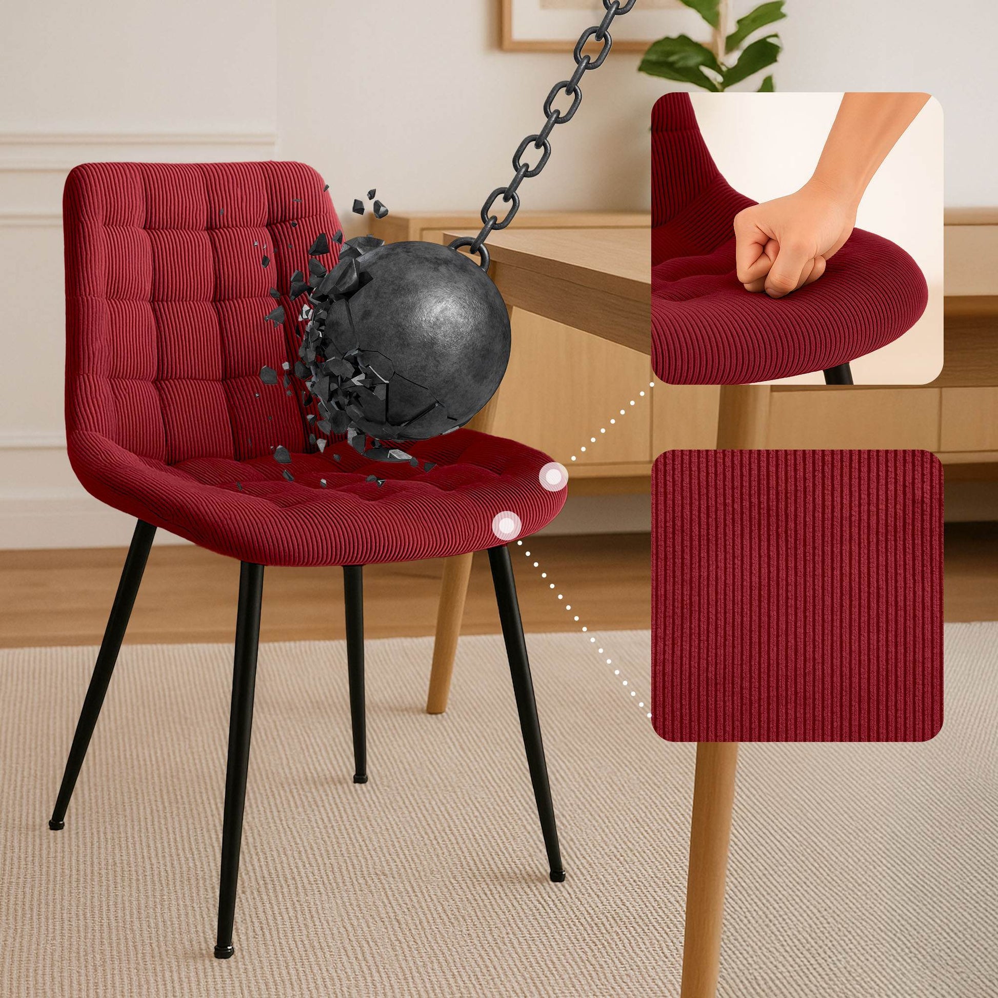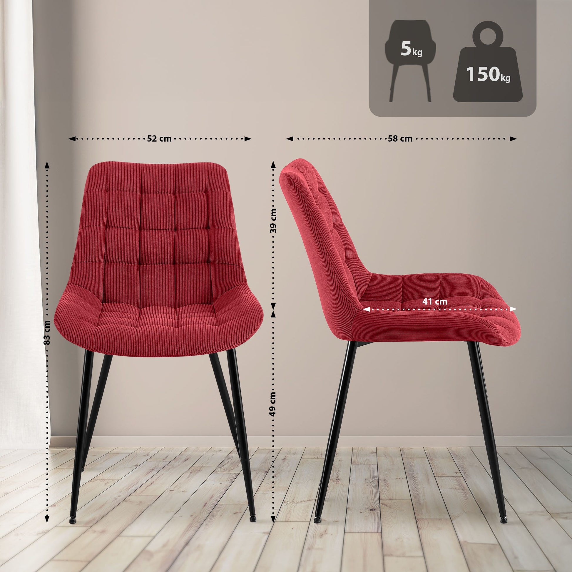 Deze eetkamerstoel combineert hoog zitcomfort met een moderne en tijdloze uitstraling. Perfect voor uw eettafel, keuken, woonkamer of andere ruimtes. De stoel biedt een uitstekende keuze dankzij de comfortabele zitting en rugleuning. De ribstof bekleding met een stijlvol quiltpatroon trekt meteen de aandacht.