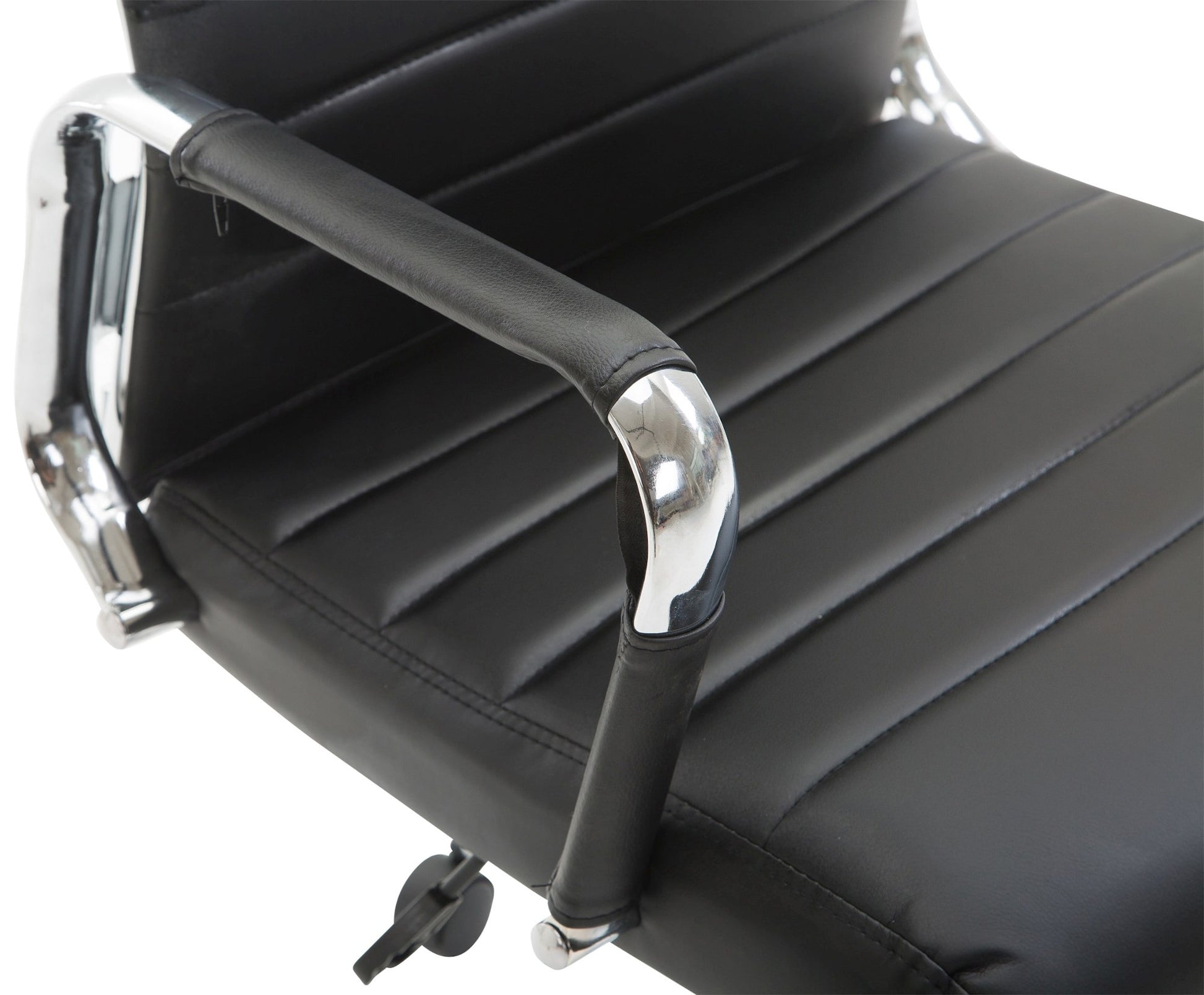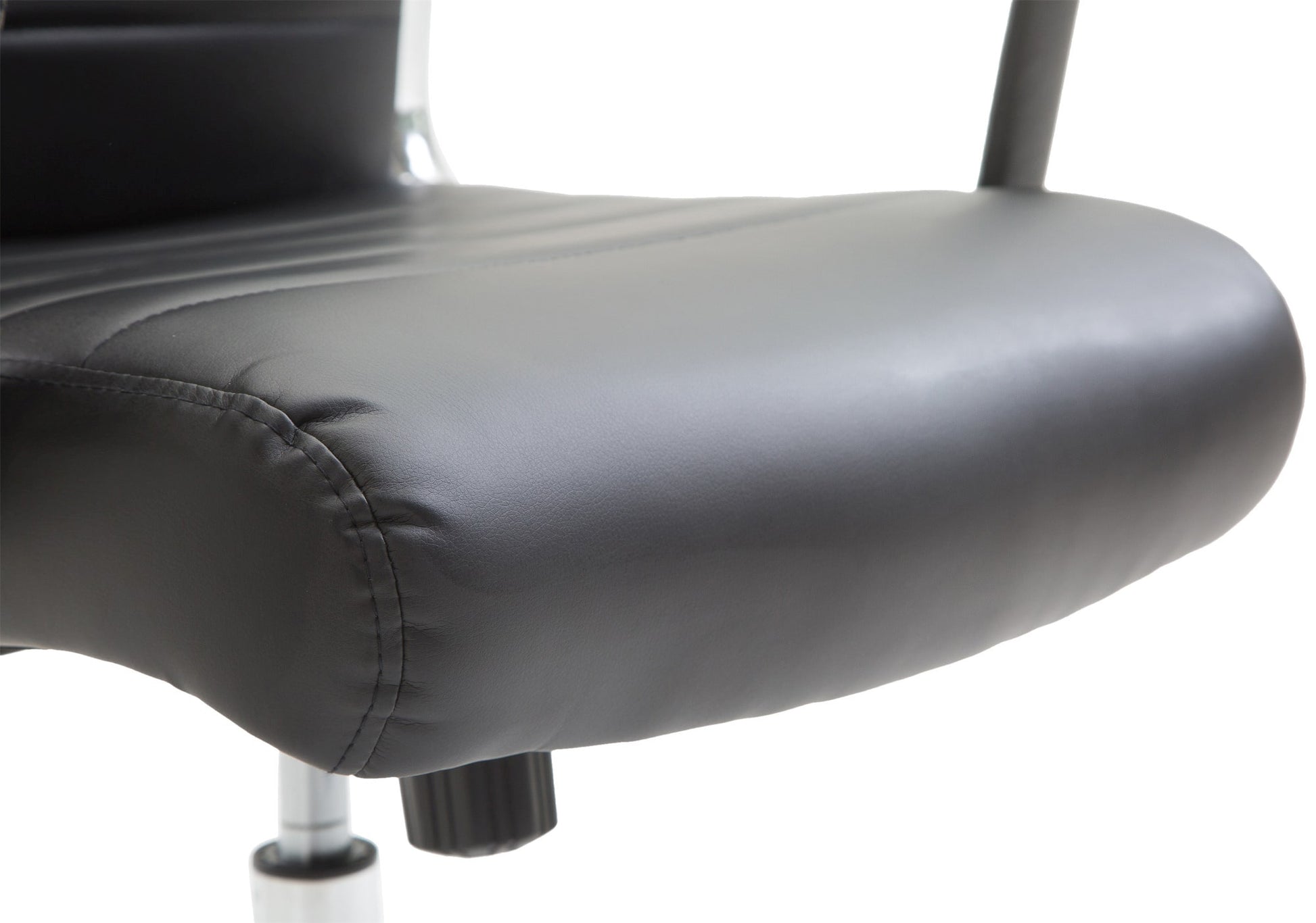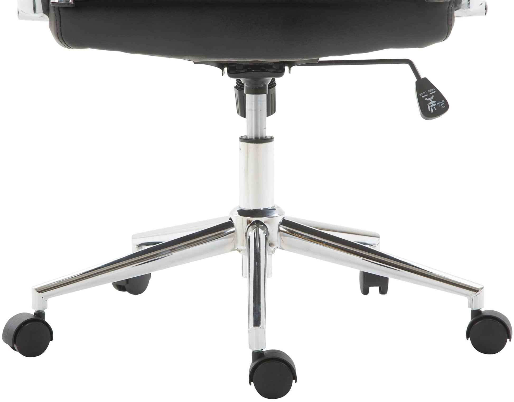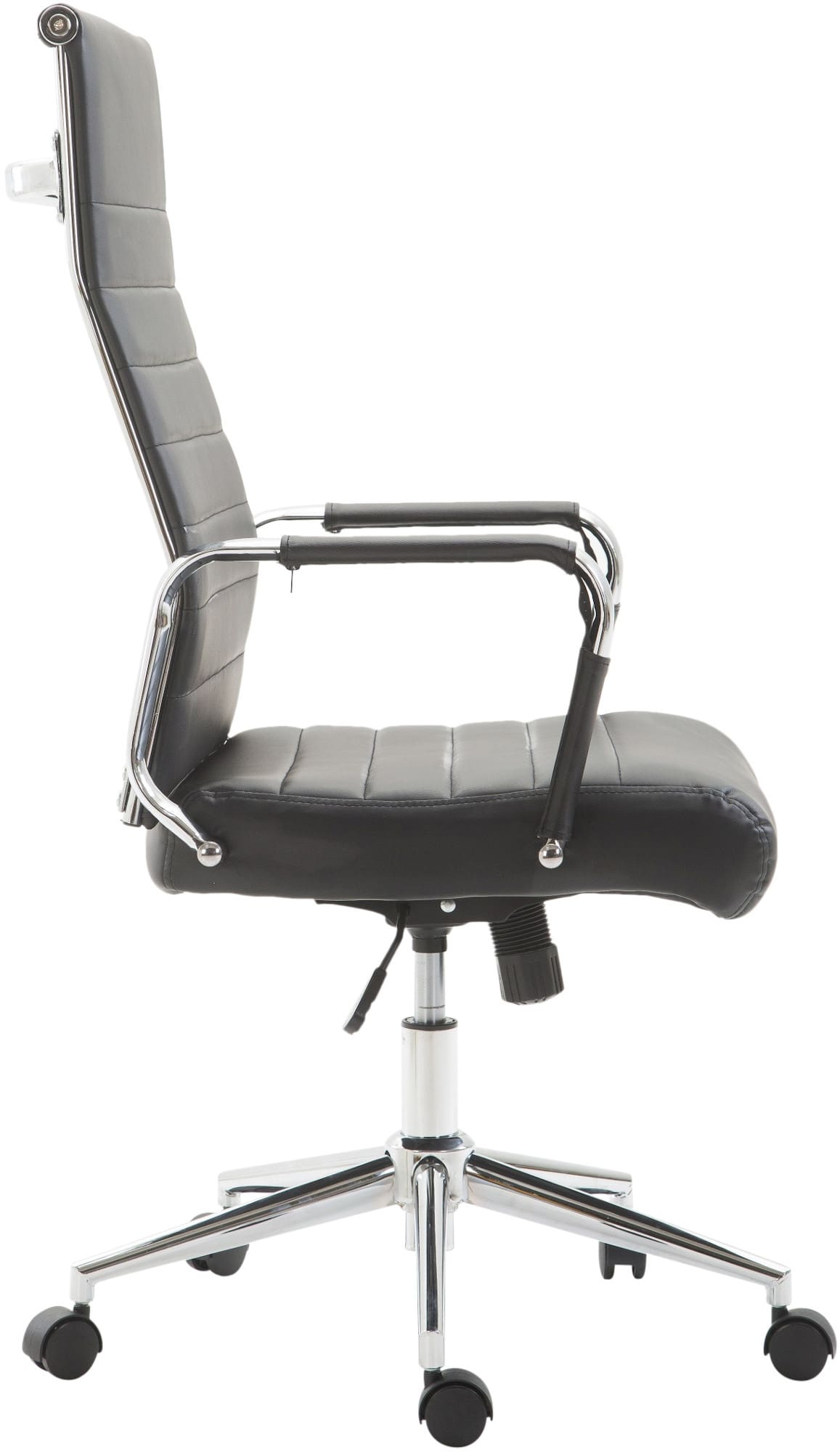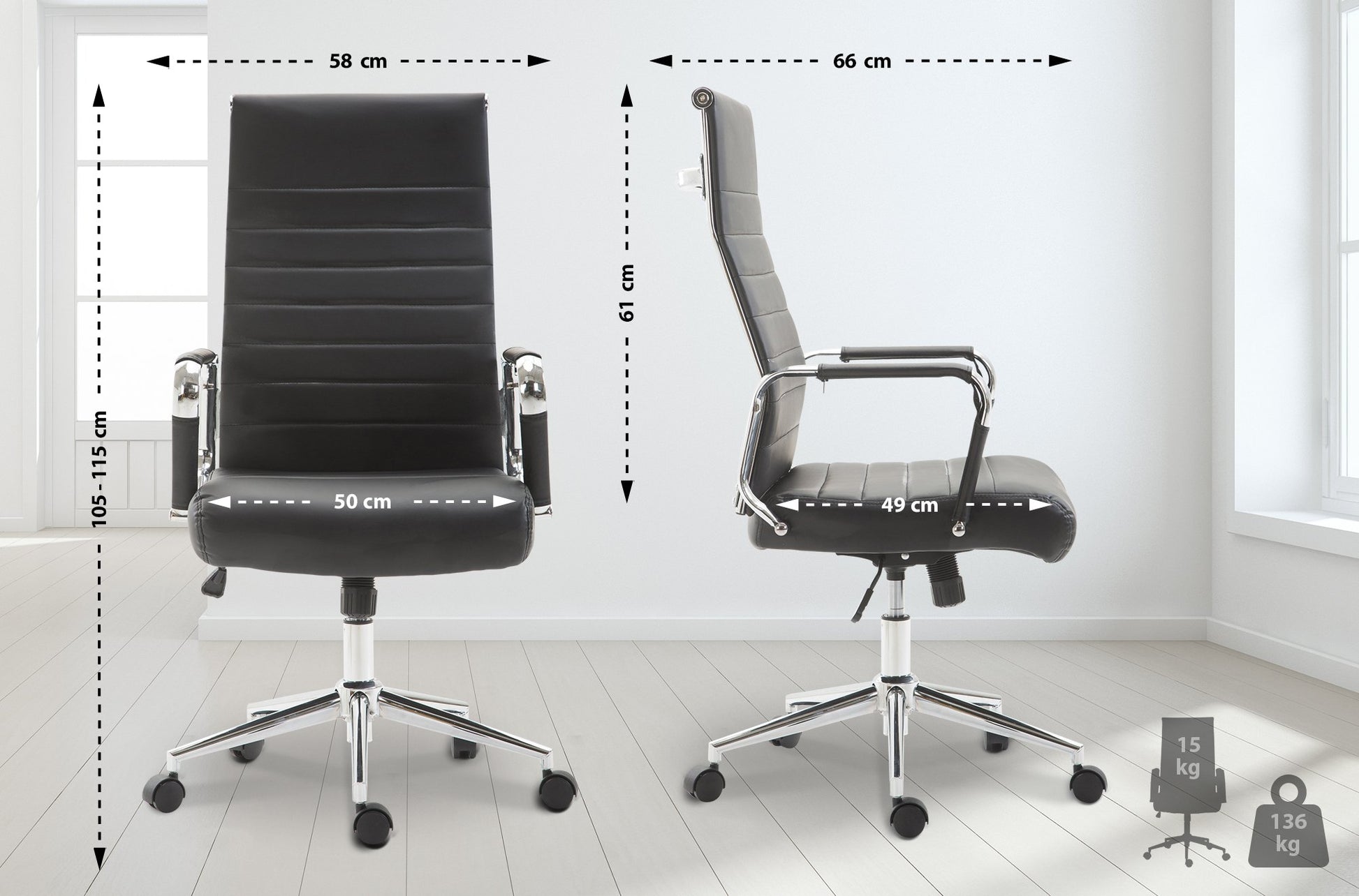 Deze exclusieve bureaustoel biedt zowel een modern uiterlijk als uitzonderlijk comfort. Dankzij de hoogwaardige bekleding en de onderhoudsvriendelijke kunstlederen hoes geniet je van een aangename zitervaring. De zithoogte is traploos verstelbaar voor een ergonomische zithouding. De stoel is uitgerust met een kantelmechanisme voor meer bewegingsvrijheid en heeft een elegant chromen frame met stevige, gebogen armleuningen bekleed met kunstleer. De stabiliteit wordt gegarandeerd door het chromen metalen frame.
