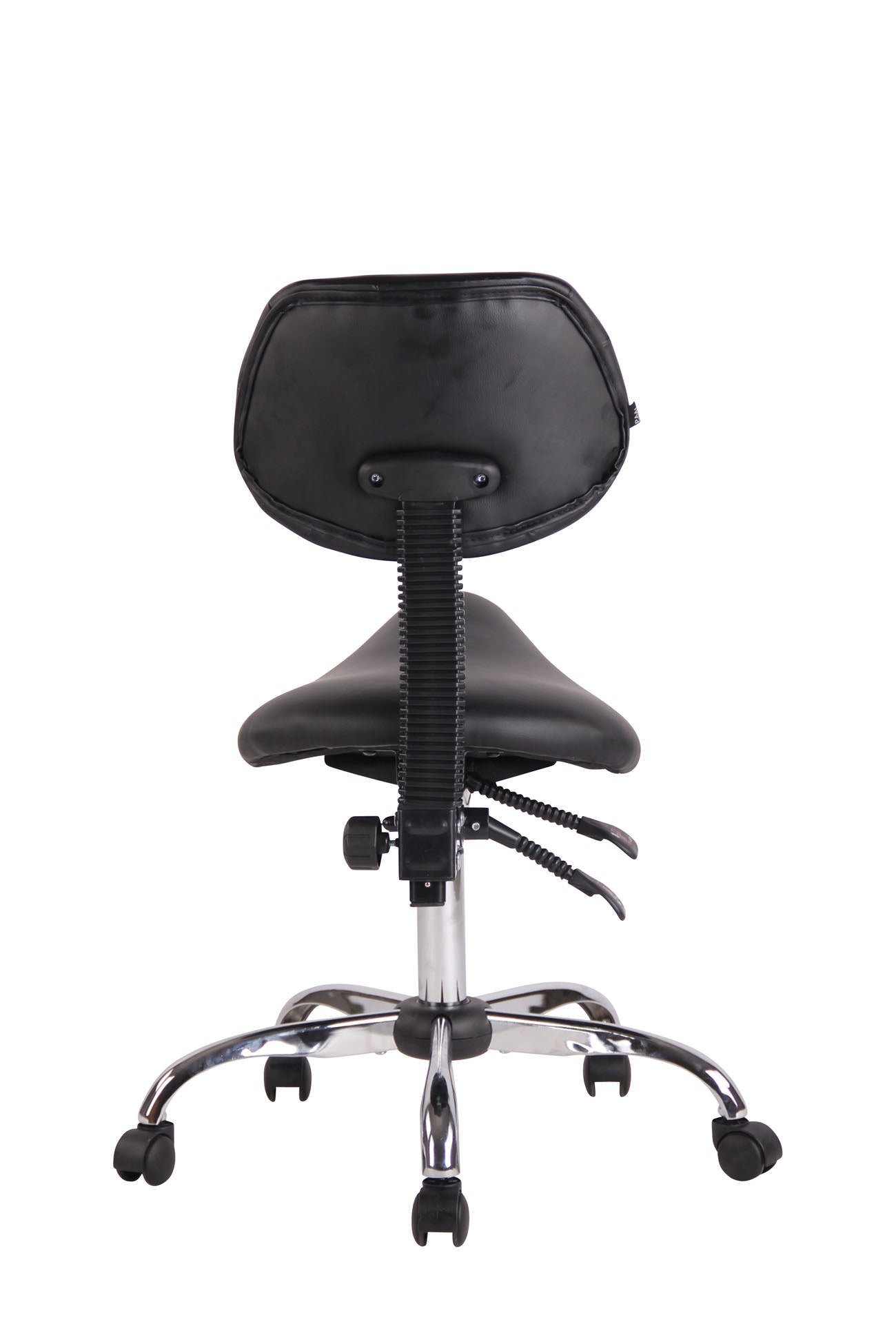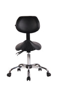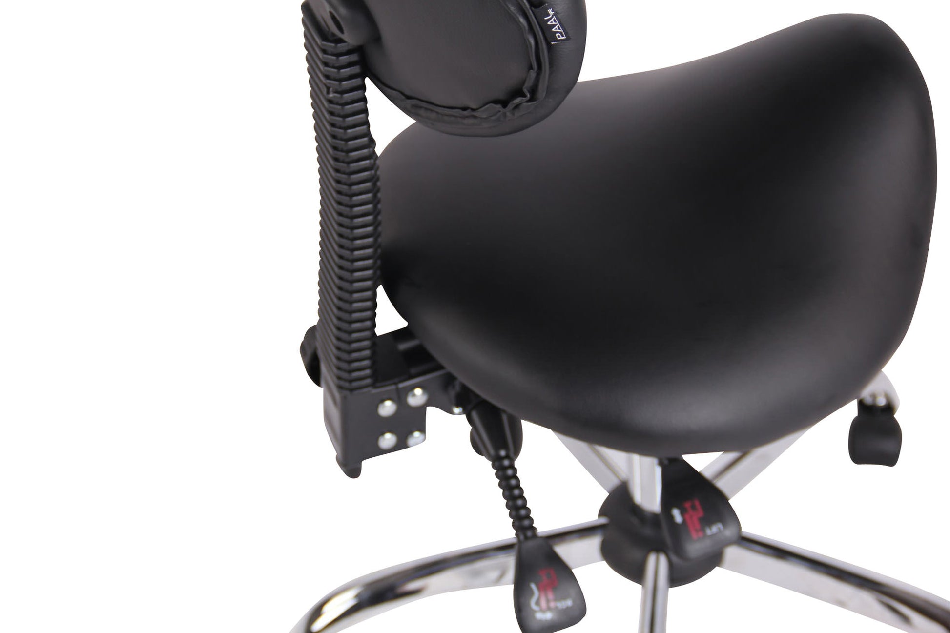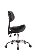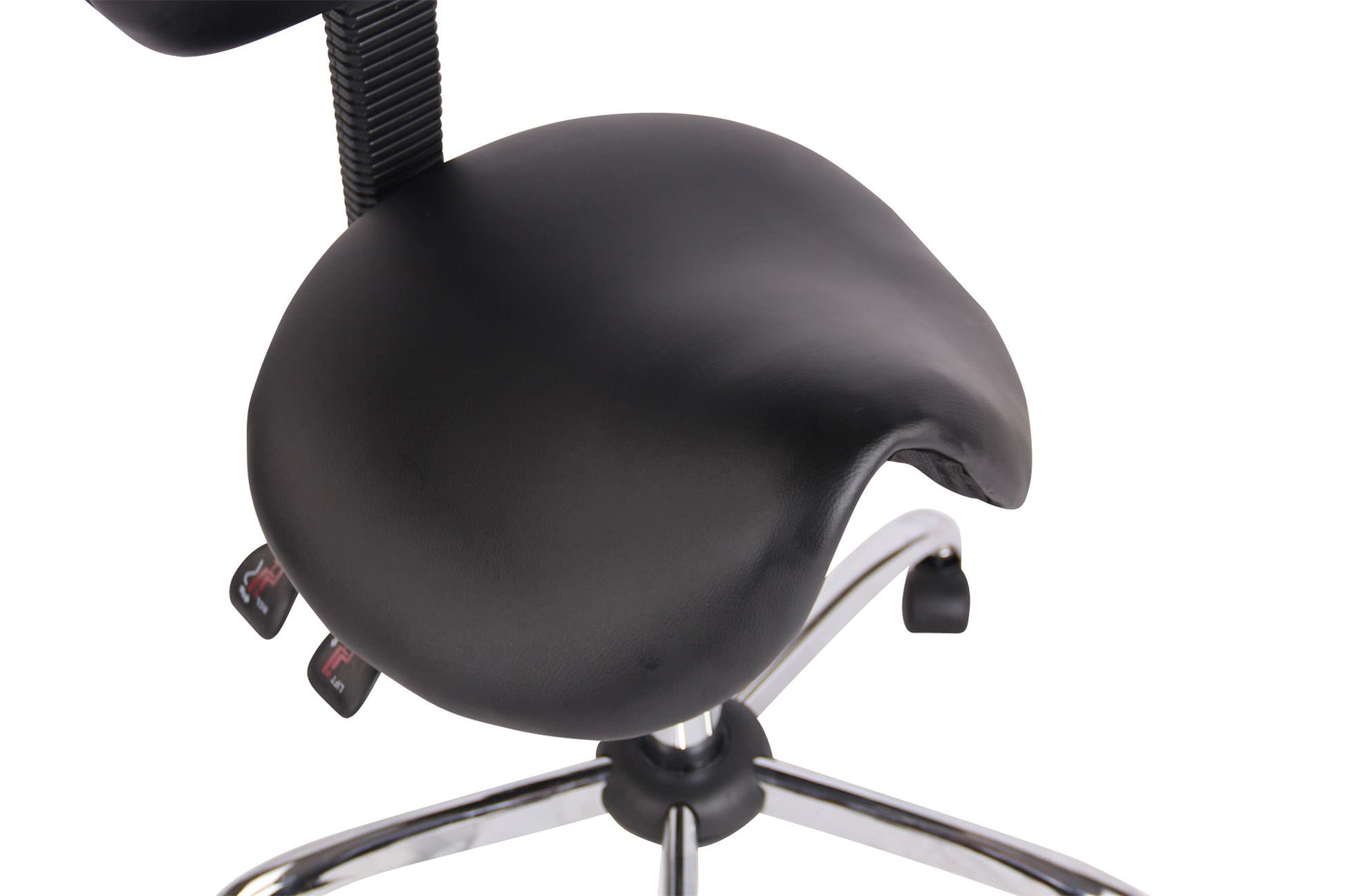 Deze veelzijdige werkkruk biedt comfort en flexibiliteit, ideaal voor gebruik in medische praktijken, massagesalons en schoonheidsinstituten. De ergonomisch gevormde zadelzitting en de kantelbare rugleuning zijn bekleed met onderhoudsvriendelijk kunstleer en zorgen voor extra zitgemak. Dankzij het stevige metalen onderstel met chroomlook en vijf soepel rollende wielen beweeg je moeiteloos over zowel harde als zachte vloeren. Het minimalistische design, gecombineerd met robuuste materialen, maakt deze kruk een betrouwbare keuze voor dagelijks gebruik.