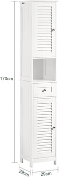 Details: Gloednieuwe witte vrijstaande hoge badkameropbergkast past perfect bij uw moderne of traditionele inrichting. Het heeft 2 sluiterdeuren met verstelbare interne planken en 1 lade, zodat u voldoende opbergruimte heeft voor al uw badkamerbenodigdheden. Ruimtebesparende opbergoplossing die ervoor zorgt dat uw badkamer netjes en georganiseerd blijft. Productdetails Materiaal/afwerking: MDF/wit. Afmetingen: B32 x D30 x H170cm. Gewicht: 15 kg. Draagvermogen: 45 kg. Het artikel wordt geleverd in een platte verpakking en vereist zelfmontage. Gedetailleerde instructies meegeleverd. De decoratieve elementen zijn niet bij de levering inbegrepen. Neem per e-mail contact met ons op als u vragen heeft. We zullen zo snel mogelijk antwoorden!