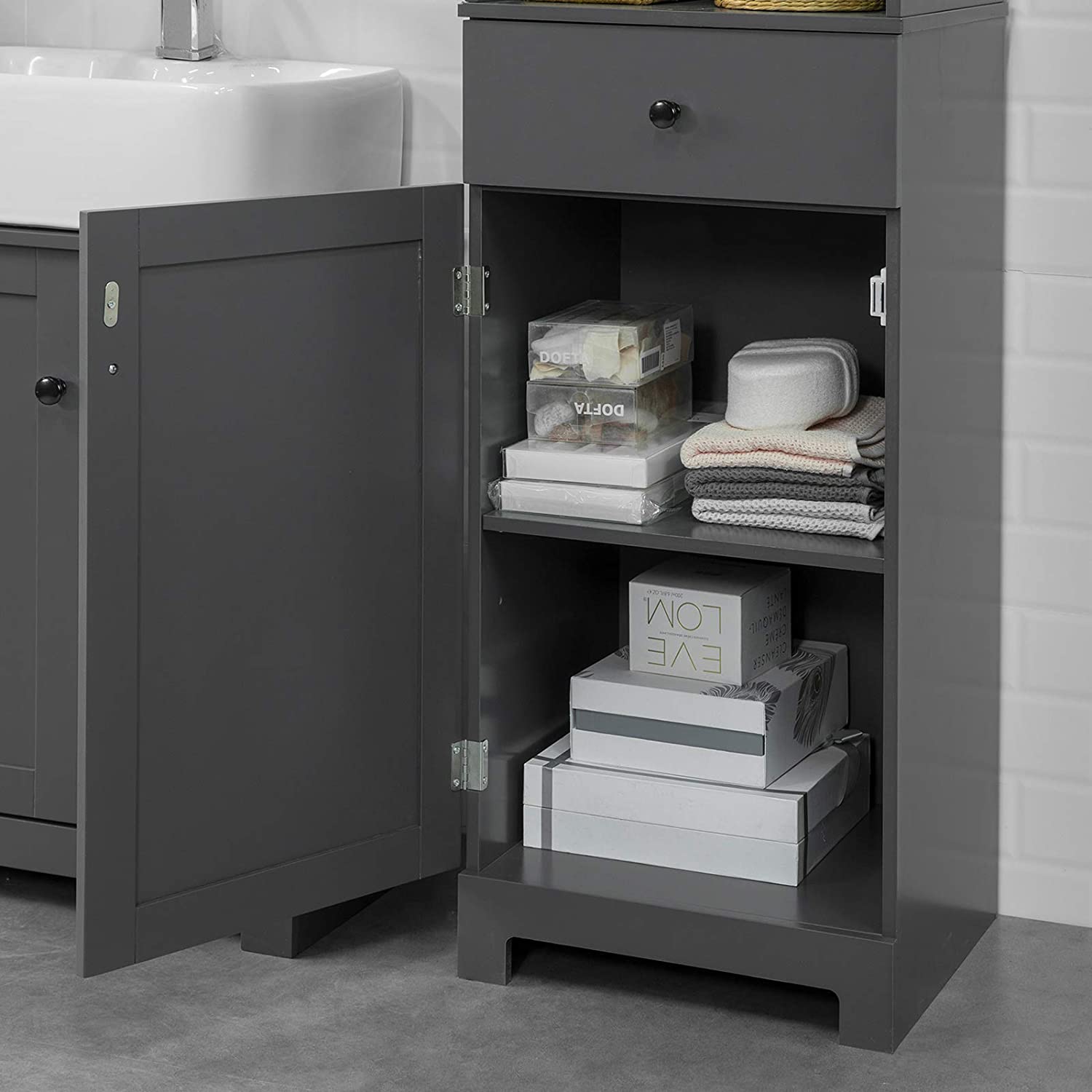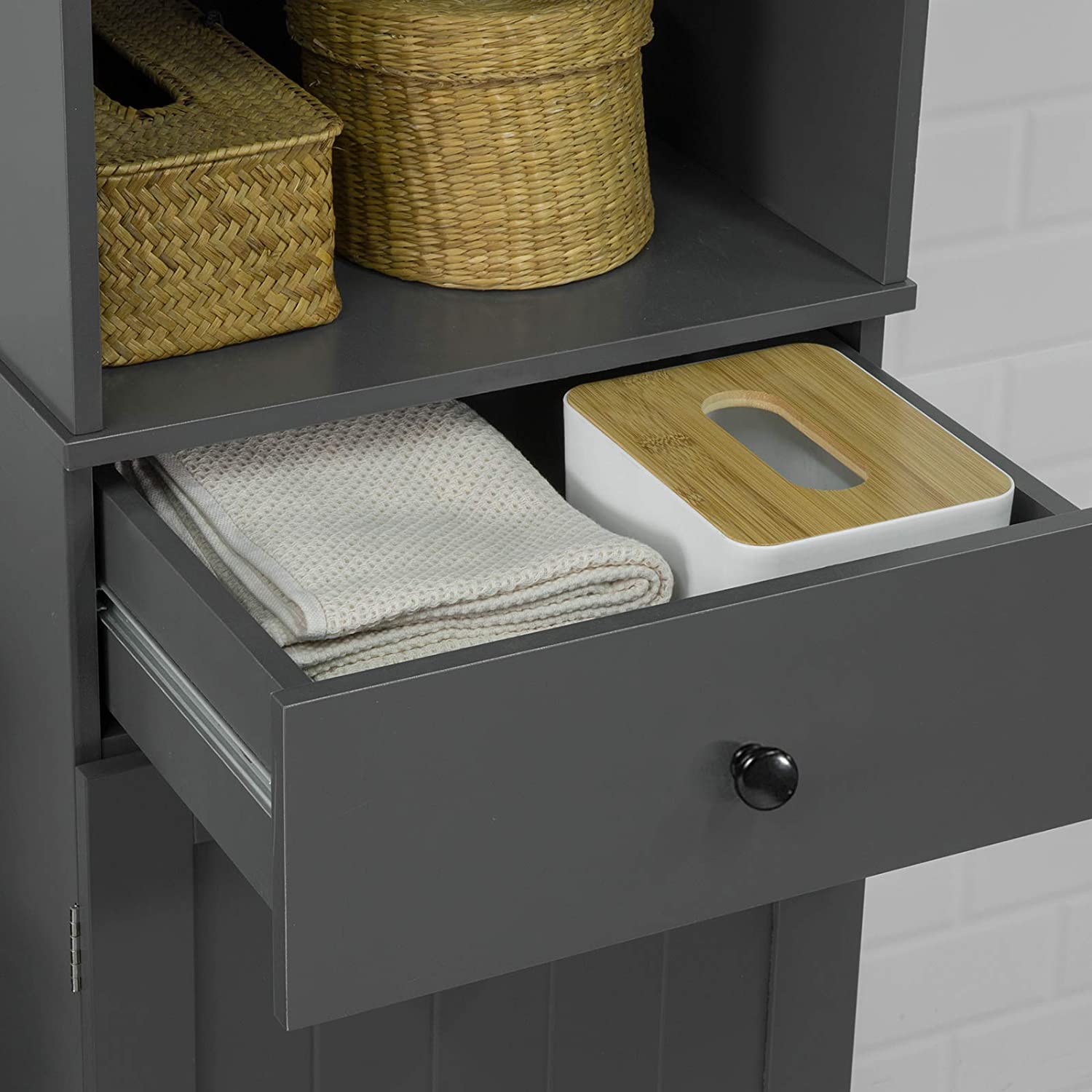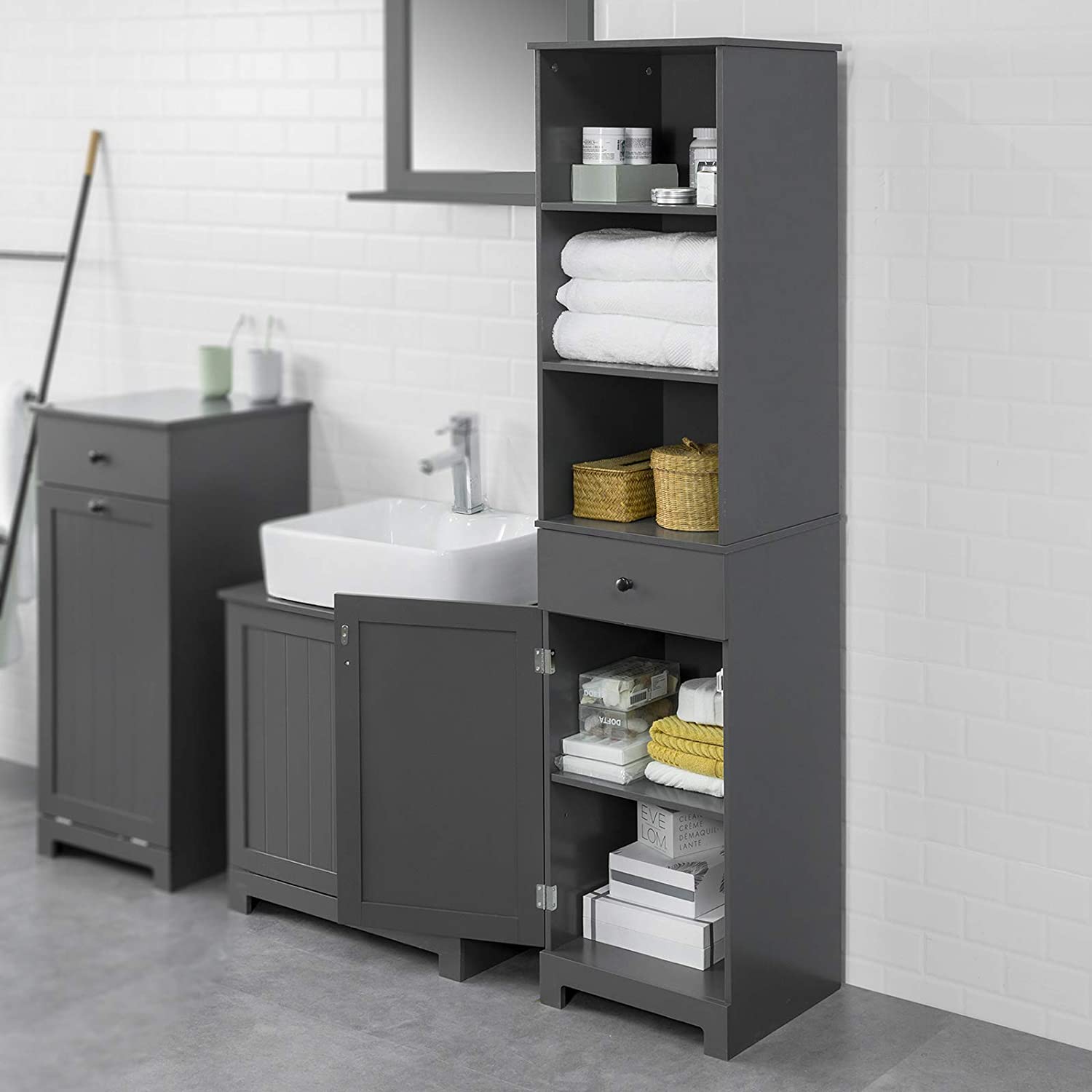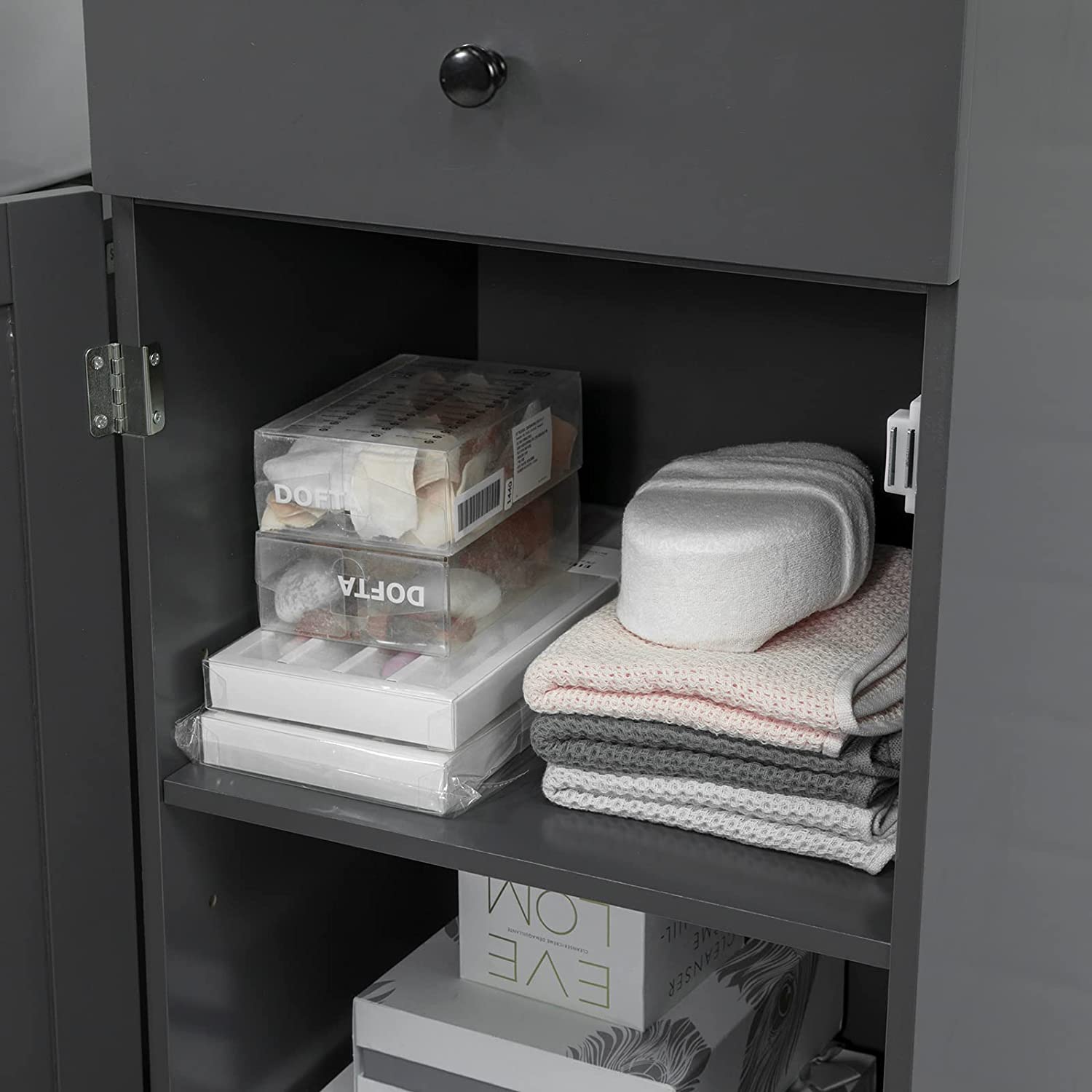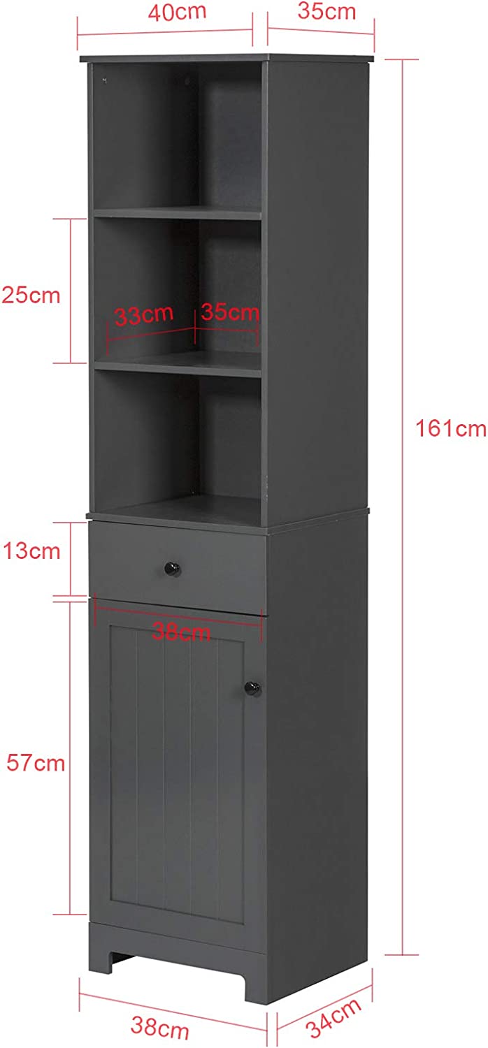 Details: Badkameropbergkast in grijze kleur creëert een onderscheidende en moderne sfeer en voegt meer opbergruimte toe aan uw badkamer. Hij heeft 3 planken, 1 lade en 1 kast met verstelbare interne plank, zodat je voldoende opbergruimte hebt voor al je badkamerbenodigdheden. Ruimtebesparende opbergoplossing die ervoor zorgt dat uw badkamer netjes en georganiseerd blijft. Productdetails Materiaal/afwerking: MDF/grijs. Afmetingen: B40 x D35 x H161cm. Gewicht: 22 kg. Draagvermogen: 40 kg. Het artikel wordt geleverd in een platte verpakking en vereist zelfmontage. Gedetailleerde instructies meegeleverd. De decoratieve elementen zijn niet bij de levering inbegrepen. Als u vragen heeft, neem dan per e-mail contact met ons op, wij zullen zo snel mogelijk antwoorden!
