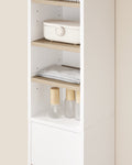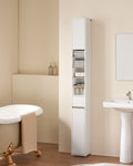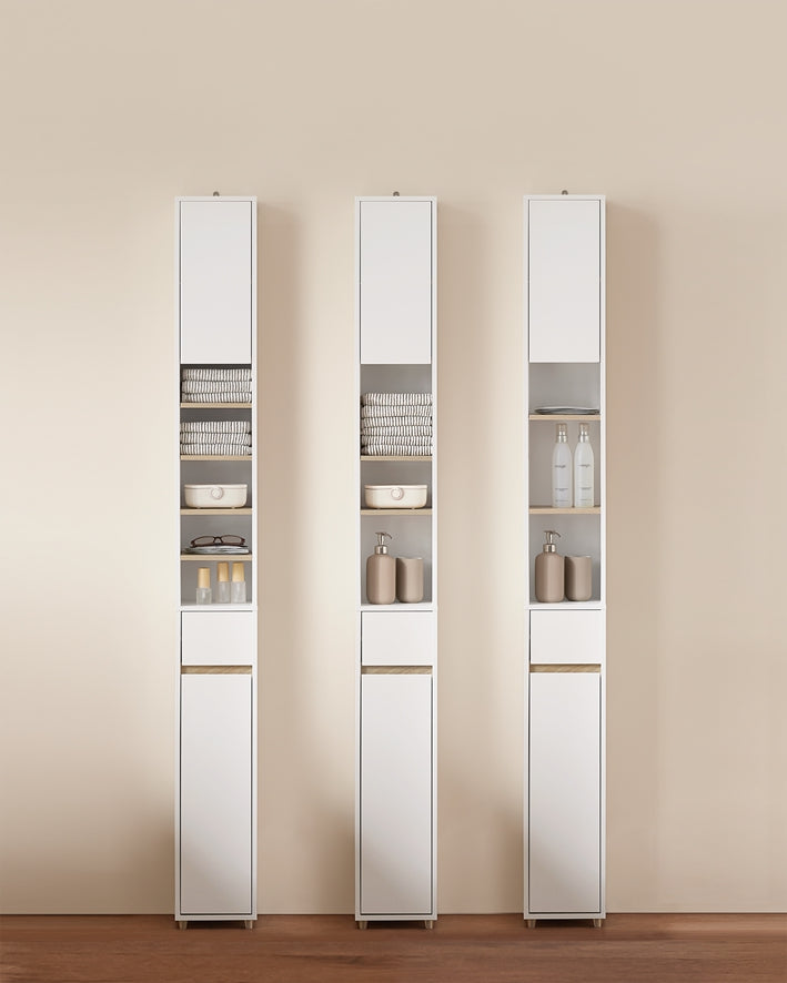 Het hoge badkamermeubel is een veelzijdige opbergoplossing met 5 compartimenten, verstelbare planken en kantelveilige bevestigingen.