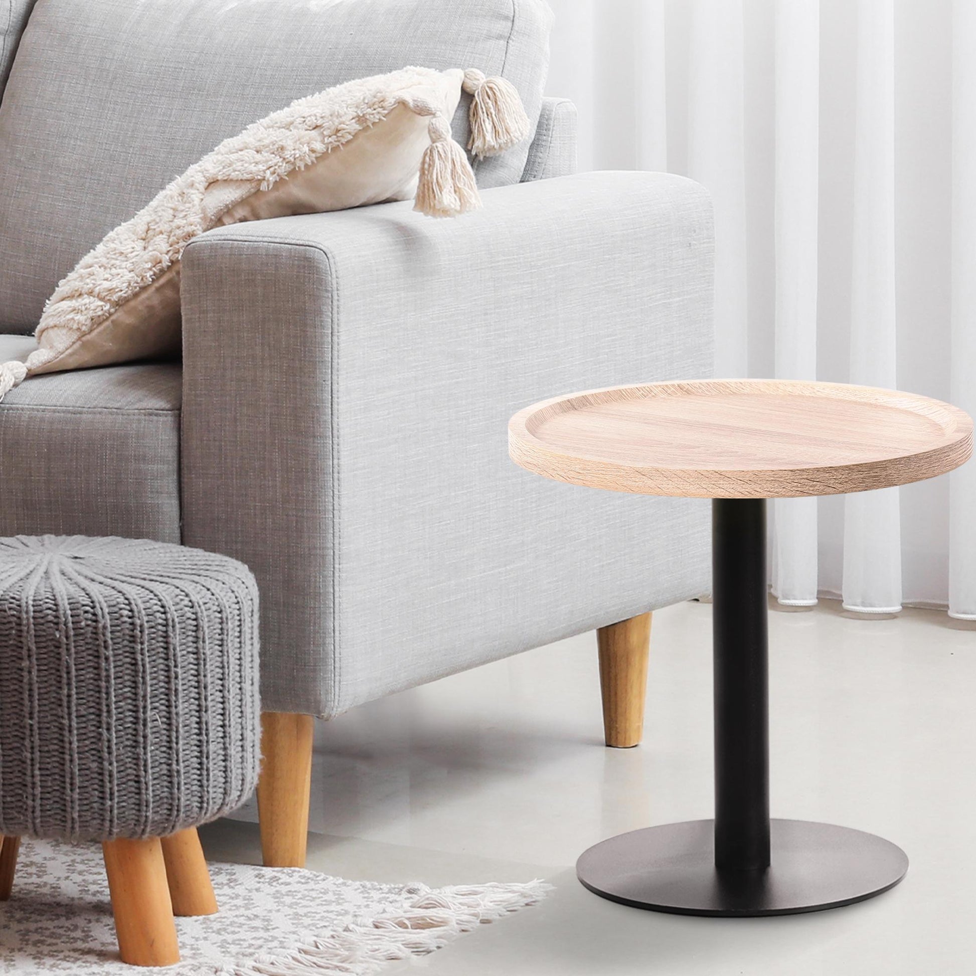 Het ronde houten blad straalt een natuurlijke en warme sfeer uit, terwijl het stevige, matzwarte metalen frame stabiliteit en een eigentijdse uitstraling biedt. Beschermers aan de onderkant beschermen delicate vloeren tegen krassen.