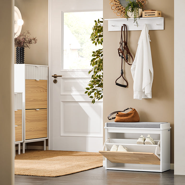 Organiseer uw entree met de Schoenenkast. Dit stevige stuk is gemaakt van MDF en rubberhout en biedt duurzaamheid tot een draagvermogen van 150 kg. Het compacte ontwerp, BHT ca. 61x47x26cm, ideaal voor kleine ruimtes. De flap zorgt voor gemakkelijke toegang tot verschillende schoenmaten, terwijl het zitkussen comfort biedt bij het aantrekken van schoenen. Combineer hem met onze wandkasten voor een complete look!