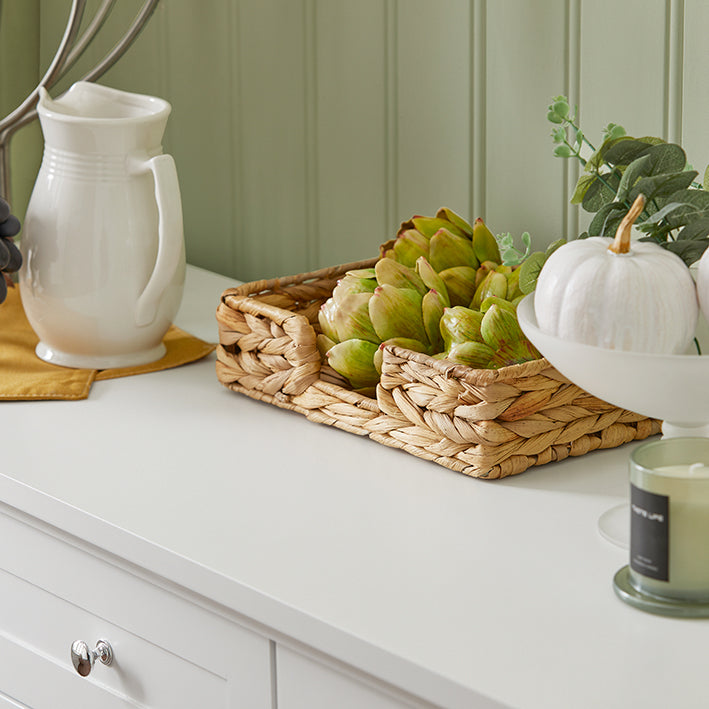 Ruime opbergmogelijkhedenDit dressoir is uitgerust met 2 lades en 2 vakken en biedt voldoende ruimte om diverse huishoudelijke spullen te ordenen, van beddengoed tot bestek, zodat je huis netjes en opgeruimd blijft.