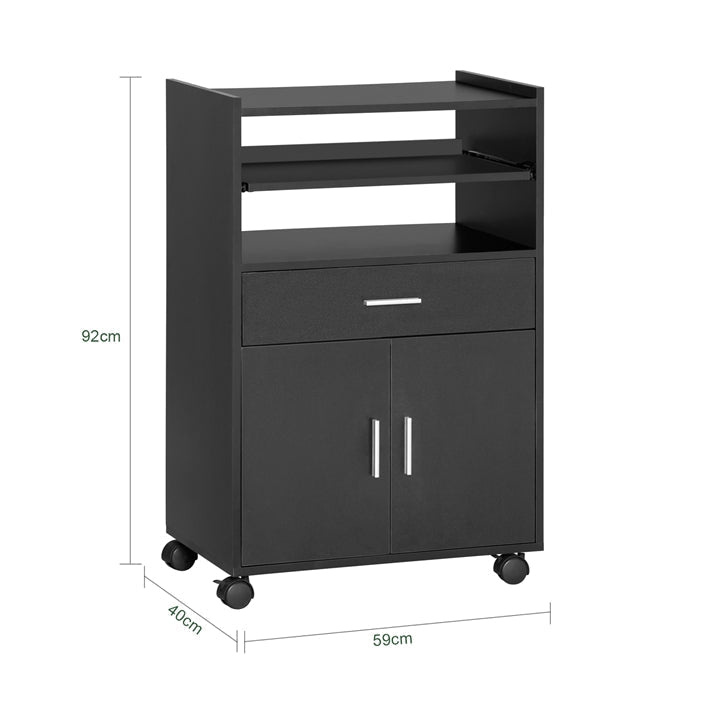 Keukenkast op wielen - Magnetronstandaard - Opbergwagen - Veelzijdig gebruik - Gemakkelijke mobiliteit met afsluitbare wielen - Ruime opbergruimte met schuifplank, lade en deuren - Duurzame MDF-constructie - 59 cm x 92 cm x 40 cm - Zwart